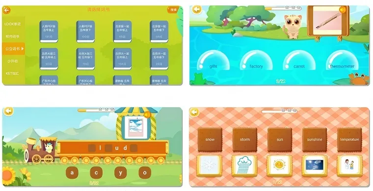 背单词也能这么好玩?没错!小猫钓鱼练熟练度,小熊开火车练拼写,饼干连连看记含义,大炮射击练听力——四款趣味游戏轮番上阵,让孩子启蒙更投入!