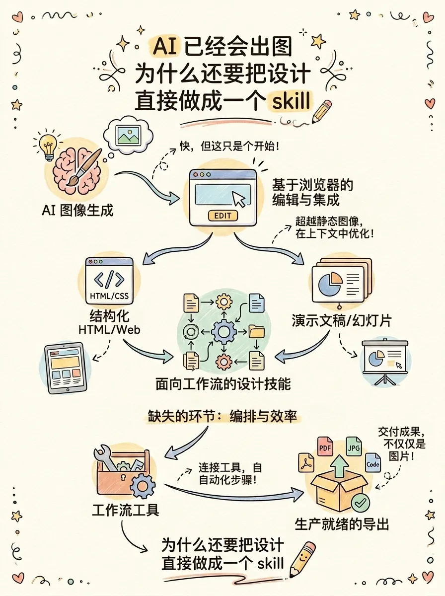我看到的不是一个单独的 skill 做得多花,而是 AI 设计工具开始往另一边长:它不只给你一个结果,它开始给你一个后面还能继续处理的东西。