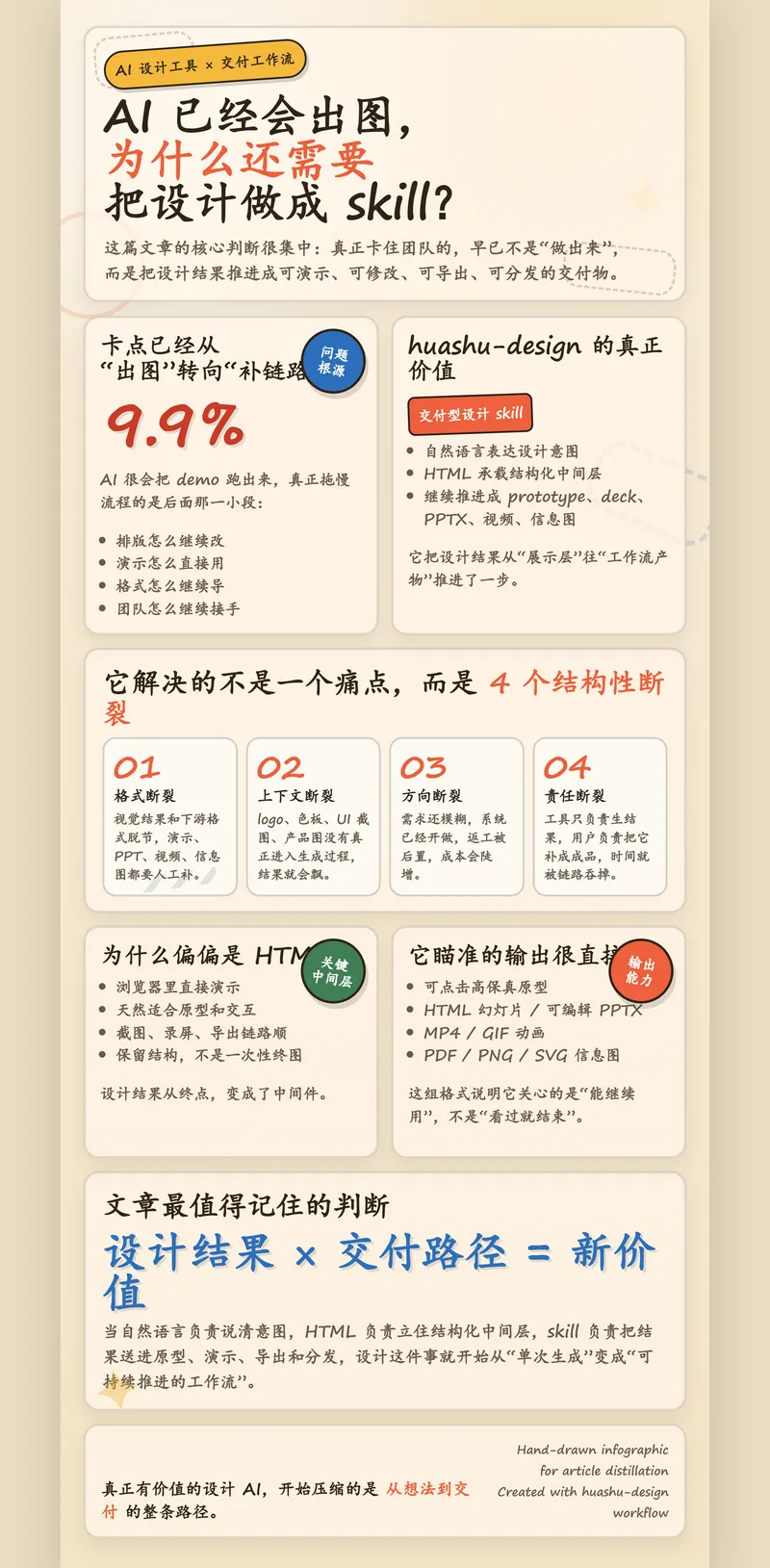 我更在意的是它把设计这件事往前推了一步:自然语言负责说清楚意图,HTML 负责把中间层立住,skill 负责把结果往交付链路里送。