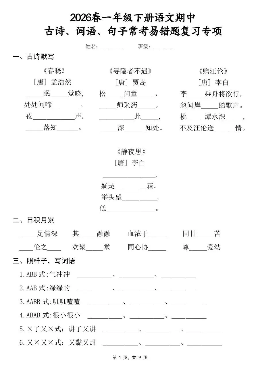 2026春新人教部编版一年级下册语文《期中复习·古诗+词语+句子常考易错题》专项练习(含答案),完整可打印