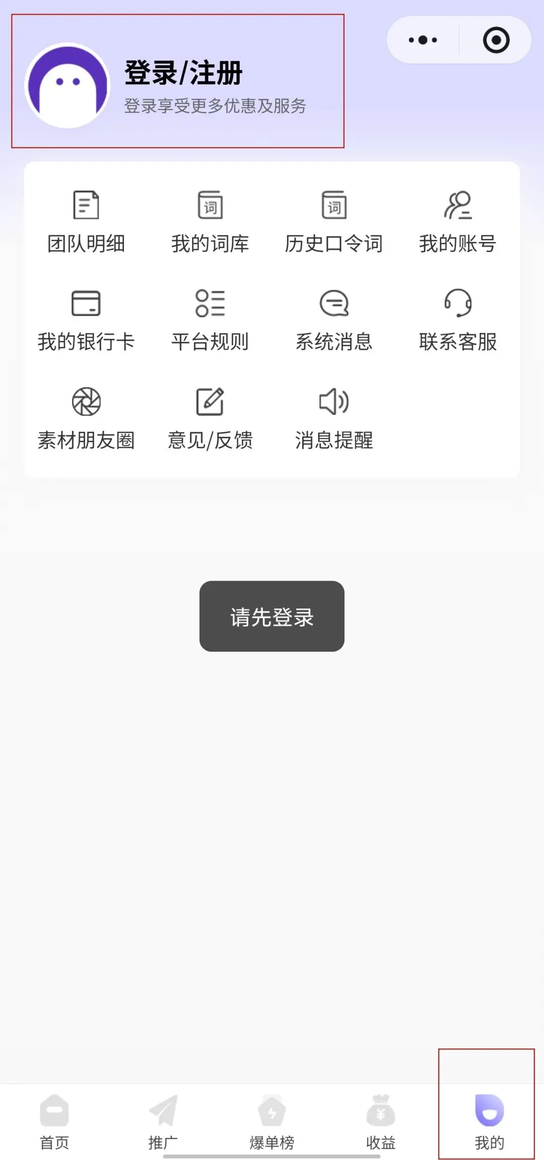 点击星推联盟x小程序进入,点击页面左上角【登录/注册】按钮,进入注册登录页面。