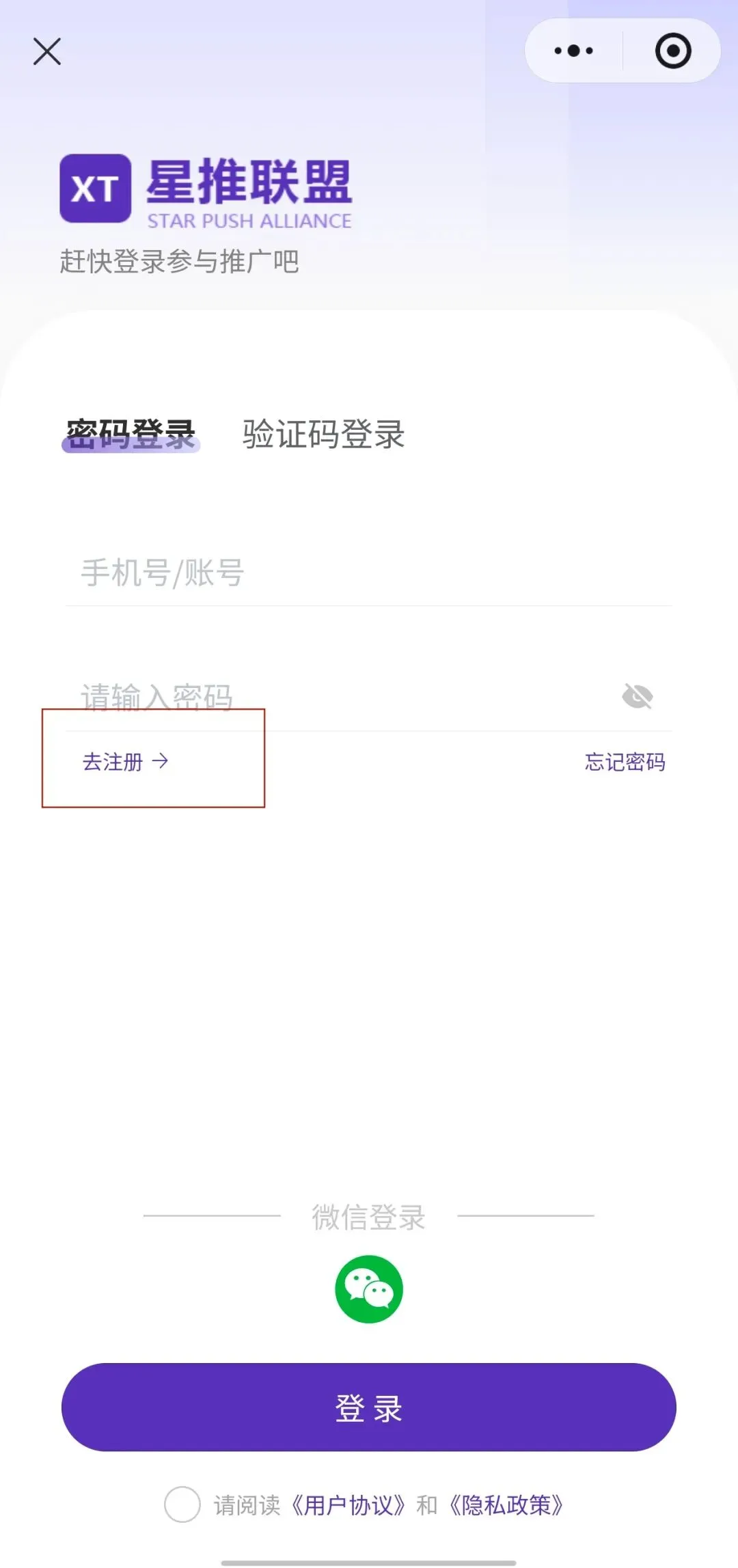 星推联盟x小程序的登录注册