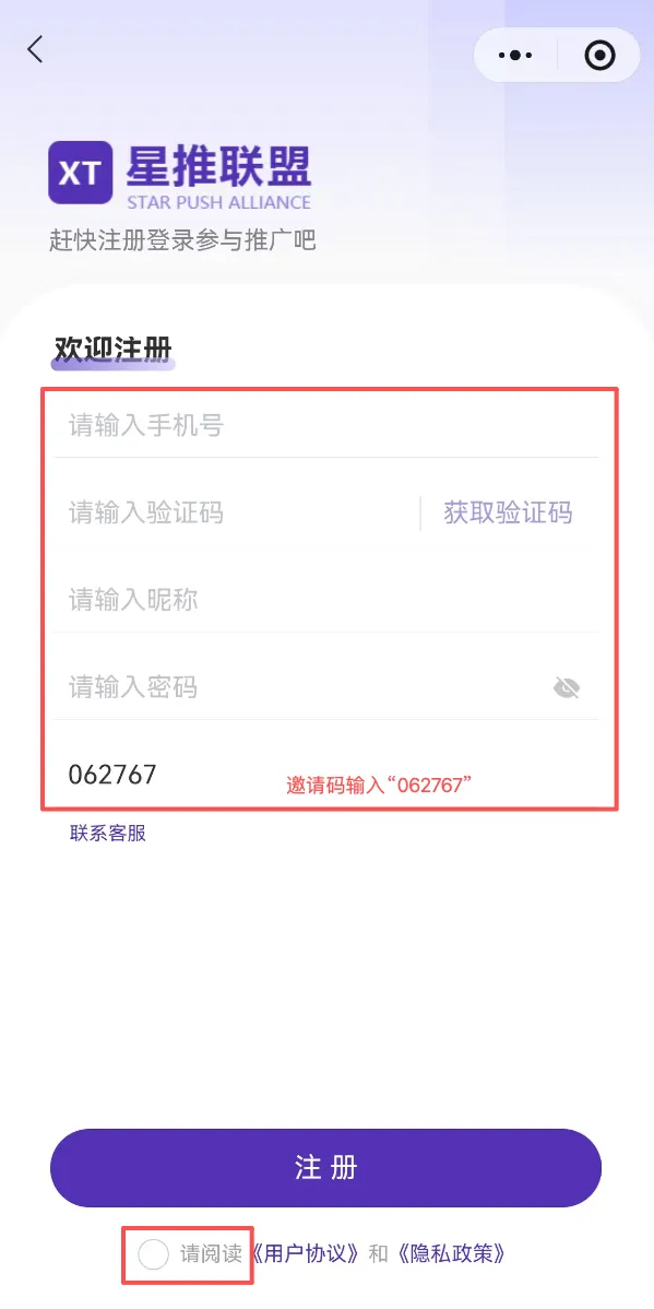 4. 点击勾选【请阅读《用户协议》和《隐私政策》】,最后点击【注册】,即可完成注册并自动登录星推联盟x小程序。