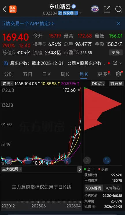 2026年4月21日,A股市场见证了一个历史性时刻——东山精密股价盘中逼近涨停,最高触及172.68元/股,创下上市以来新高,截止收盘价公司股价维持在169.40元,市值一举突破3000亿元大关。而就在市值突破的前一天晚上,公司刚刚交出了一份颇为亮眼的成绩单,2025年全年营收首次突破400亿元,达401.25亿元,同比增长9.12%;归母净利润13.86亿元,同比增长27.67%。