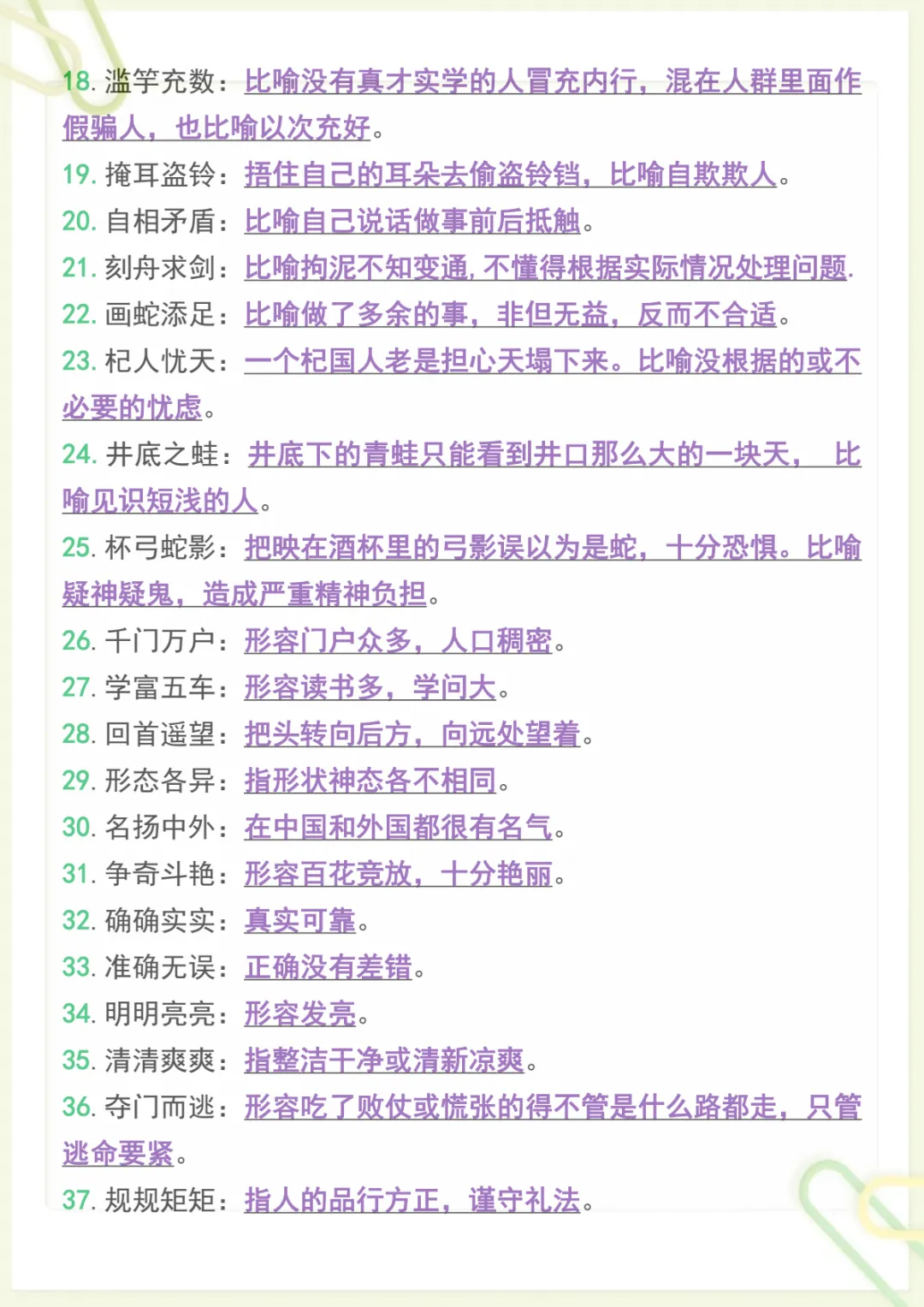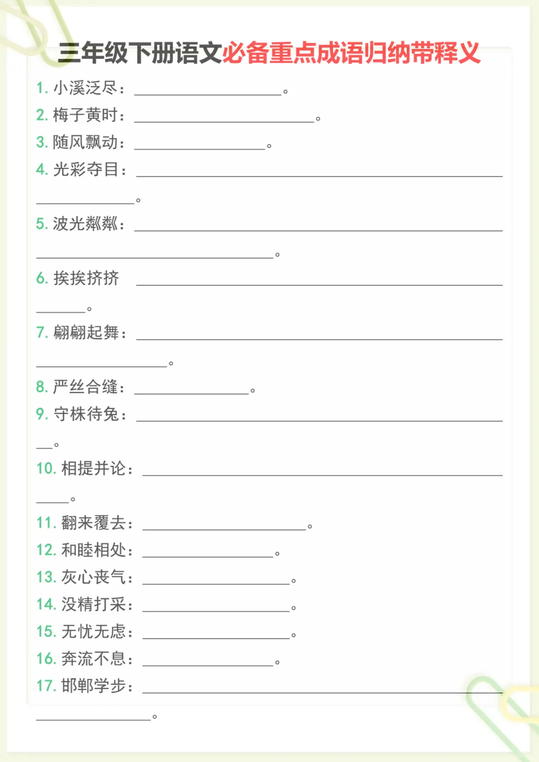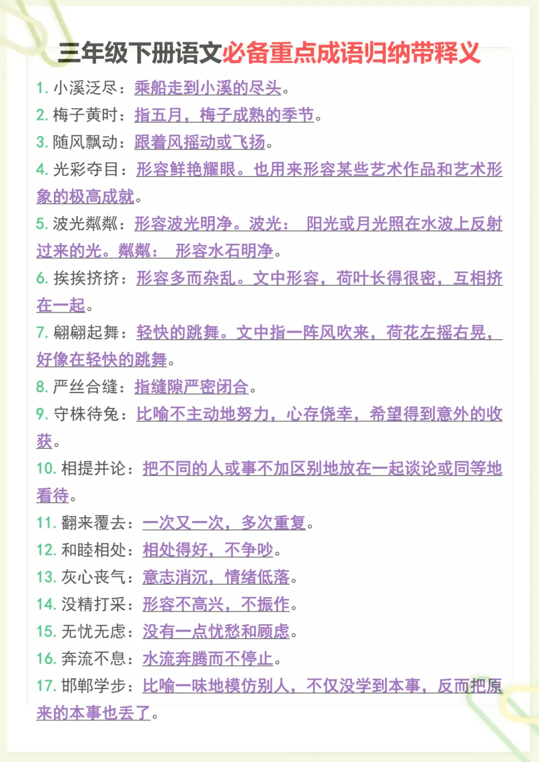 三年级下语文必备重点成语归纳带释义,共7页,电子版可下载可打印,这份资料围绕三年级下册语文学习中的常见重点成语进行系统整理,包含成语积累、含义理解与释义记忆等内容,帮助孩子在日常学习中更好地掌握词语运用,夯实语文基础,提升阅读理解和表达能力。需要的家长可以尽快下载打印出来,让孩子随时学一学、记一记。