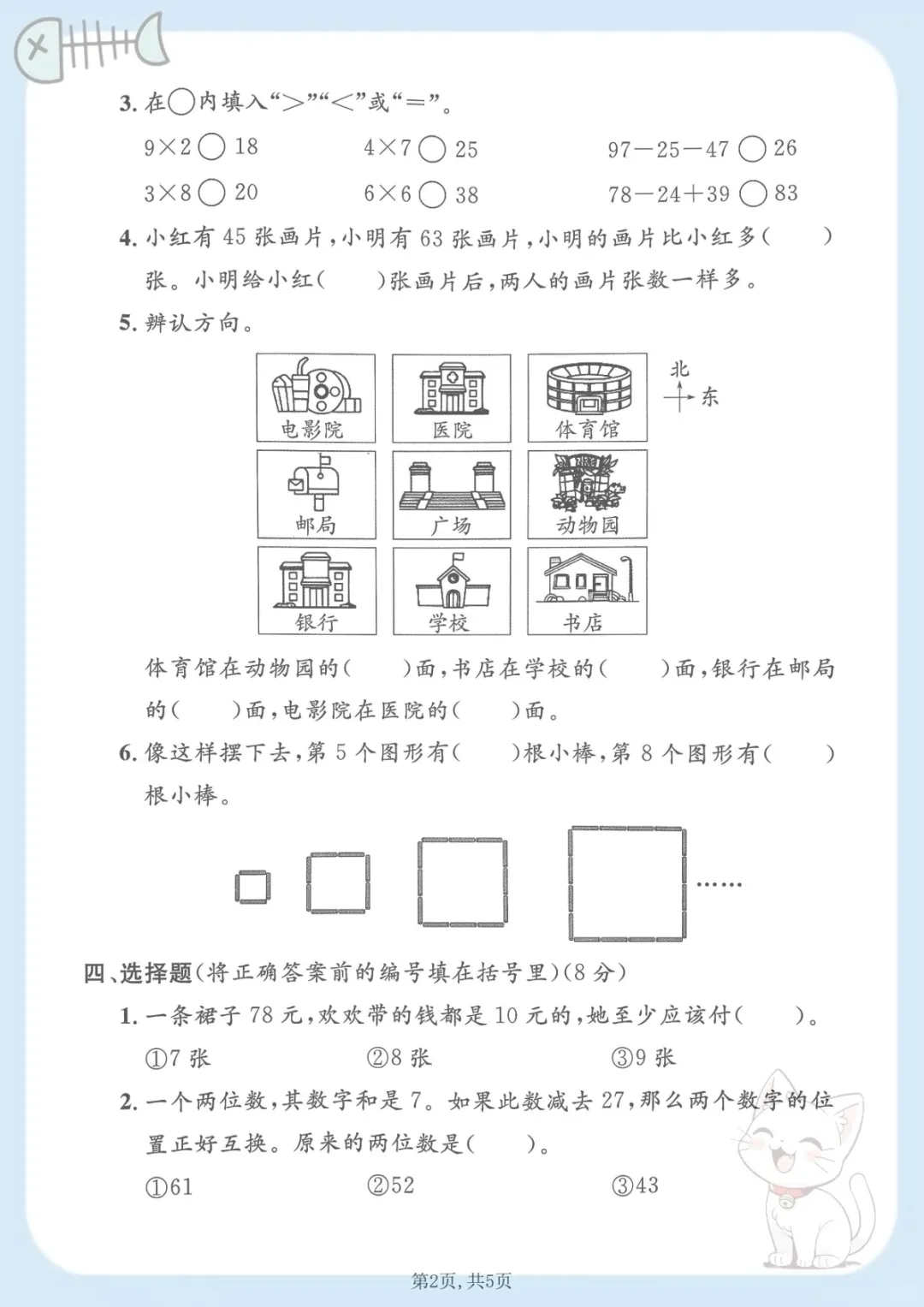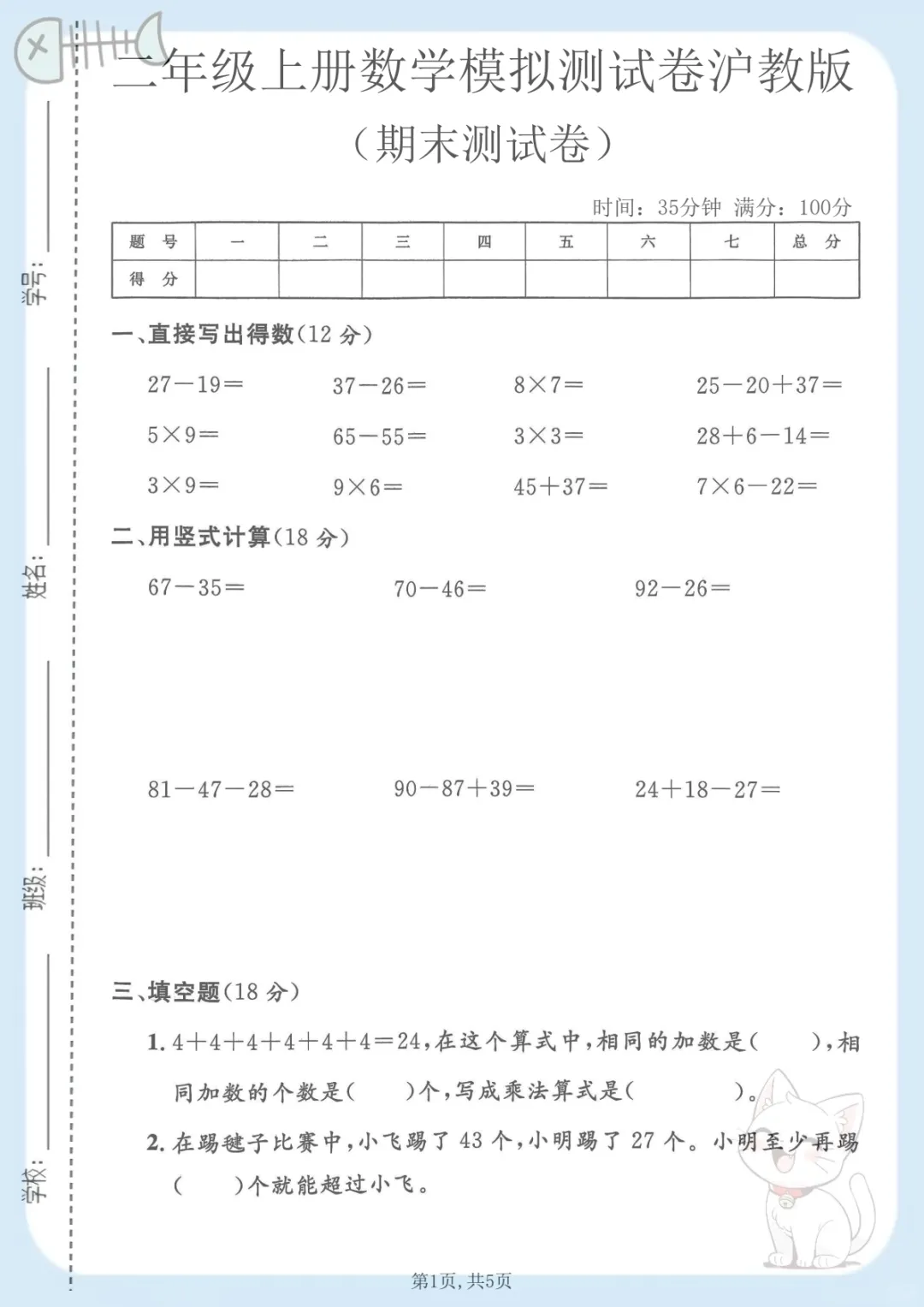 二年级上数学期末模拟测试卷1《沪教版》,共5页,电子版可下载可打印,这份期末模拟测试卷紧扣二年级上册数学学习内容,适合孩子在期末前进行系统自测与查漏补缺,涵盖多个核心知识点与专项训练内容,帮助家长更有针对性地了解孩子的掌握情况,及时巩固薄弱环节,需要的家长可以赶紧下载打印出来,让孩子练一练。