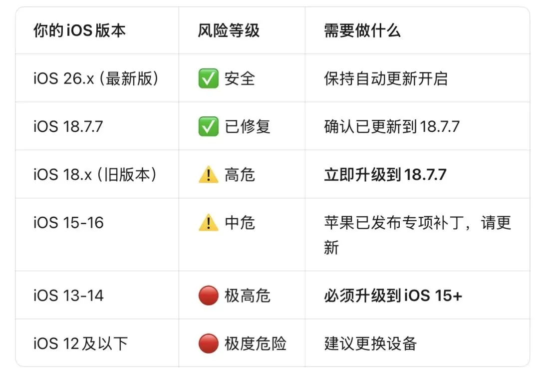 覆盖范围:所有运行iOS 15至iOS 26的设备均已获得相应安全保护,但前提是你必须更新到对应版本的最新补丁!