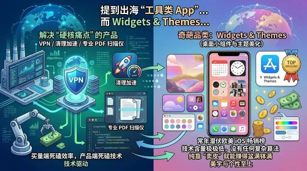 提到出海“工具类 App”,很多人脑海里第一反应就是 VPN、清理加速、或者是极其专业的 PDF 扫描仪。这些解决“硬核痛点”的产品,往往需要在买量端死磕效率,在产品端死磕技术。 然而,在欧美 iOS 畅销榜上,常年潜伏着一类技术含量极低、没有任何复杂算法、纯靠“卖皮”就能赚得盆满钵满的奇葩品类——Widgets & Themes(桌面小组件与主题美化)。