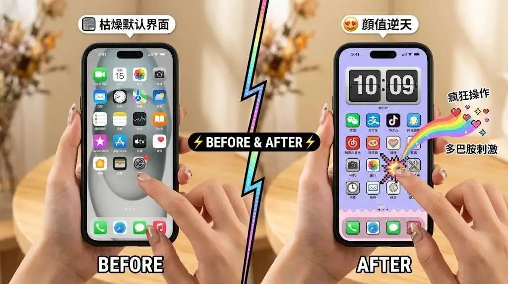 在 TikTok 和 Instagram Reels 上,这类产品最顶尖的转化素材,是没有人脸出镜的。 视频往往是第一人称视角:一只手拿着一部枯燥的默认界面 iPhone。伴随着极其清脆的点击声,这只手开始疯狂操作——长按桌面、添加一个极具设计感的复古翻页时钟小组件、一键替换所有的社交软件图标为极其可爱的像素风。短短 10 秒,整个手机桌面焕然一新,颜值逆天。 这种“Before & After”的极其强烈的视觉反差,配合“改造/装扮 (Makeover)”带来的多巴胺刺激,能瞬间击中年轻女性群体的冲动神经,点击率(CTR)高得令人发指。
