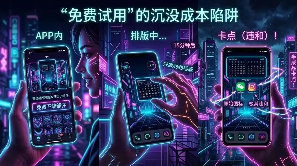 用户进入 App,看到成百上千套绝美的主题,兴奋不已。 系统极其大方地允许你免费下载并应用其中某一个部件(比如只换个壁纸,或者只给你一个免费的日历小组件)。 当用户花了一刻钟,兴致勃勃地把日历和小组件排版好,却发现自己的微信、Instagram 图标还是原始的绿色和彩色,与整个极其暗黑酷炫的赛博朋克桌面风格极其违和。 这就是极其腹黑的“半成品卡点”!