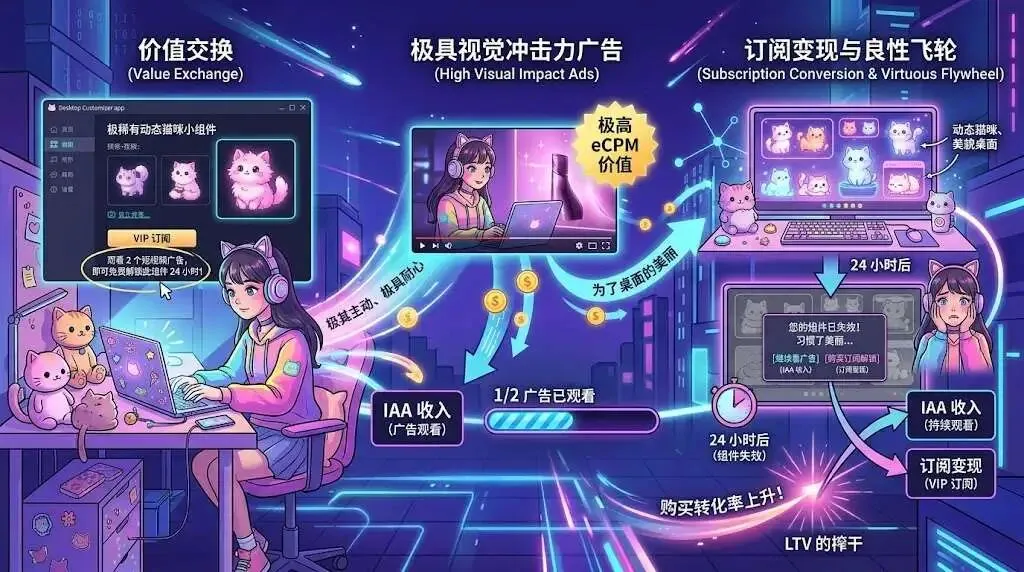 “广告换特权 (Unlock with Ads)” 系统不会强硬地弹出全屏广告去恶心用户。而是采用“价值交换”。 你看中了一套极其稀有的“动态猫咪小组件”但不想买 VIP?没关系,按钮下方有一个极小的选项:“观看 2 个短视频广告,即可免费解锁此组件 24 小时!” 为了维持桌面的美丽,这群小女孩会极其主动、极具耐心地看完这些极高 eCPM 价值的激励视频。而当 24 小时后组件失效时,由于习惯了这种美貌,她们要么继续看广告(提供持续的 IAA 收入),要么忍受不了繁琐,最终乖乖掏钱买断订阅。