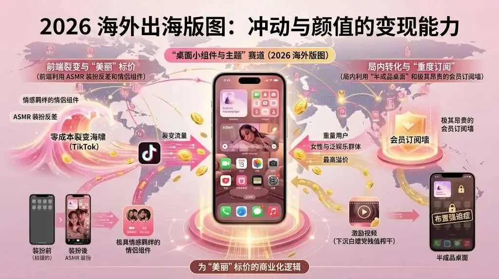 在 2026 年的海外出海版图中,永远不要低估“冲动与颜值”的变现能力。“桌面小组件与主题”赛道,向我们完美演示了如何用最轻量级的技术,收割最高溢价的女性和泛娱乐群体。在前端利用 ASMR 装扮反差和极具情感羁绊的情侣组件,在 TikTok 掀起零成本的裂变海啸;在局内利用“半成品桌面”激发布置强迫症,设置极其昂贵的会员订阅墙;最终用激励视频对下沉白嫖党进行残值榨干。看懂这套为“美丽”标价的商业化逻辑,你就能在极其枯燥的工具赛道中,挖出一座永远不会枯竭的粉色金矿!