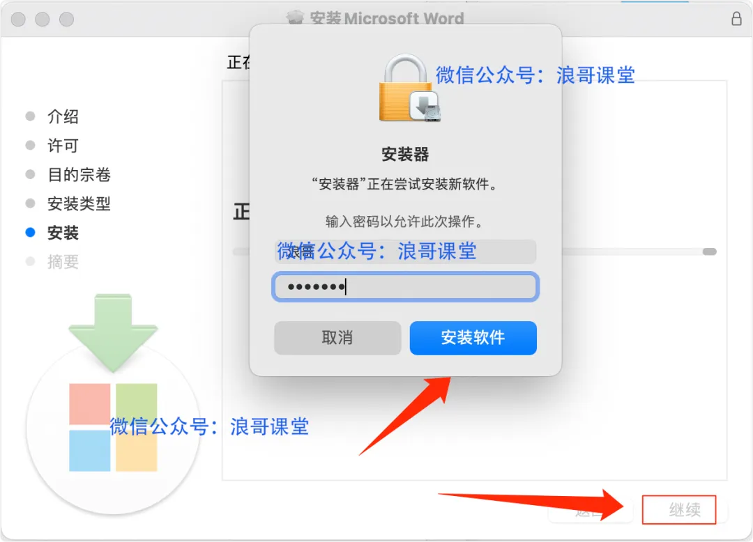 | 7、点击「安装」,然后输入电脑登录密码,点击「安装软件」; |