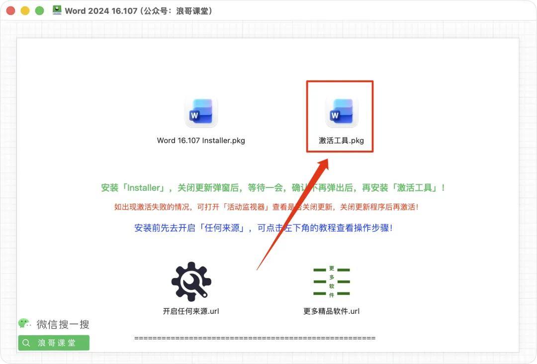 | 11、返回软件安装镜像,双击开始安装「激活工具.pkg」; |