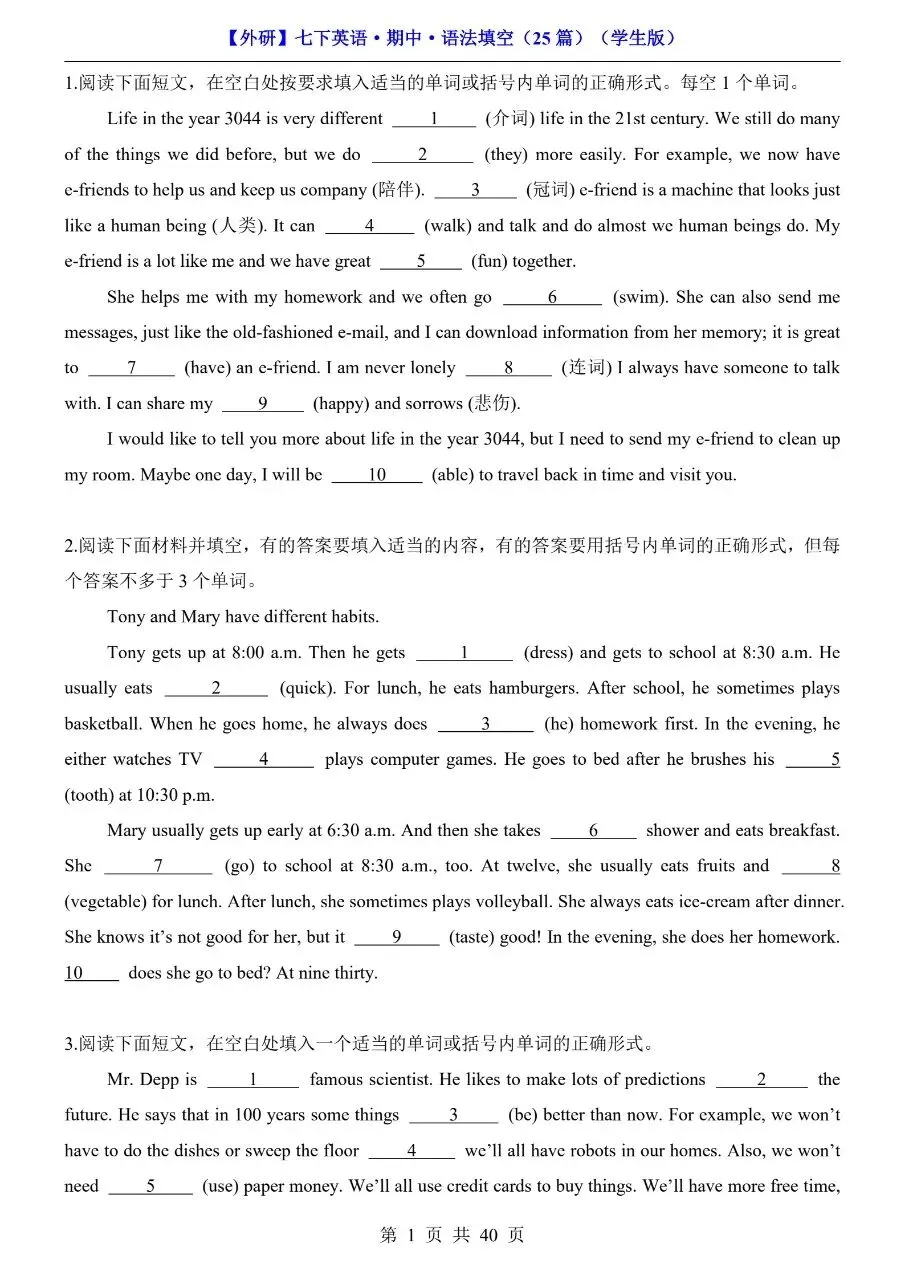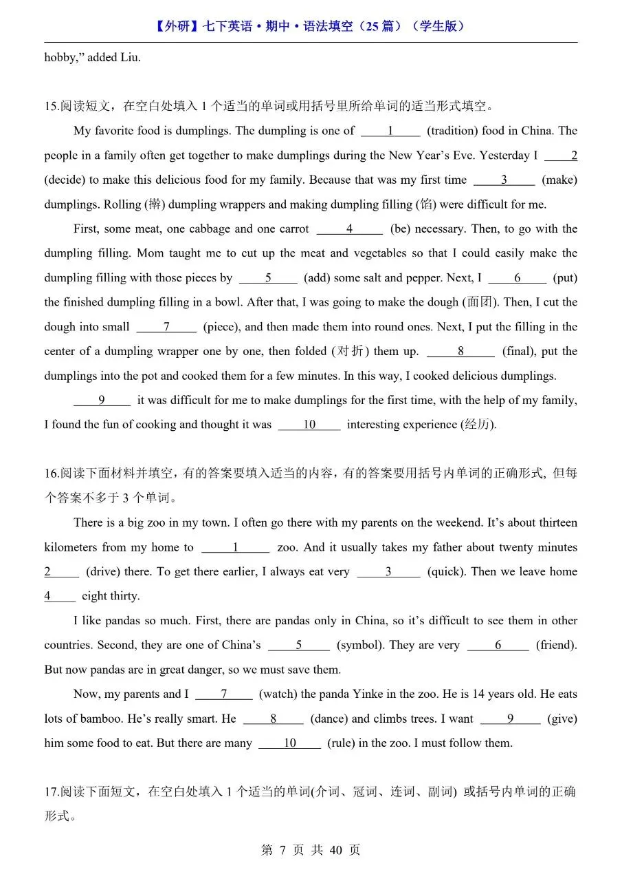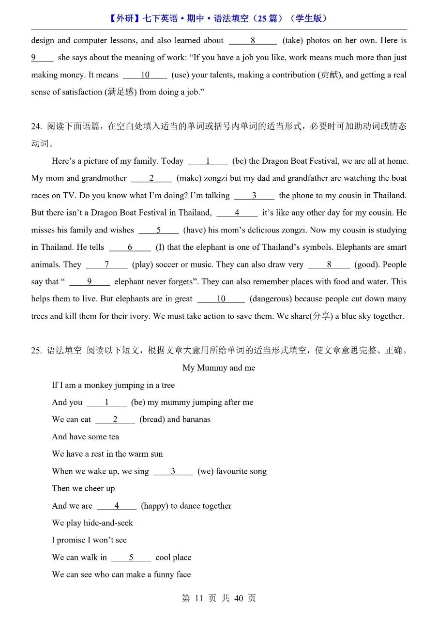 26年春七年级下册英语外研版语法填空专项练习题!附解析和答案!完整可打印! 今日分享:初一英语分水岭,语法填空丢分太致命!时态混乱、词形变换抓不准、介词介词乱用,短文填空一错全错?别担心!专为七年级下册外研版学生整理语法填空专项练习题,紧扣教材语法考点,覆盖时态、非谓语、固定搭配等核心内容,每空附详细解析+答案,不仅给答案,更教你解题思路,孩子吃透方法、做题不踩坑,轻松拿下语法填空高分! 初一英语语法是初二、初三进阶的核心基础!这份外研版专项练习,精准对接考点,破解语法填空难题,帮孩子告别“凭感觉蒙”,实现“精准做对”,英语成绩稳步提升! 需要的家长可打印出来给孩子读记练习! 萌兔快印 I彩印5分 打印清晰 篇幅有限,仅展示部分内容 获取完整电子版: ①:点一点右下角的“赞”和“推荐”,谢谢! ②:关注公众号,公众号对话框发送关键词“电子版”! 特别声明 本微信公众账号分享的资源版权属于原出版机构或影像公司,本资源为电子载体,传播分享仅限于家庭使用与交流心得、参考和辅助购买决策。文章中的视频及图片均来自网络,版权归原作者或原出版社所有。如有侵权,请及时联系删除。