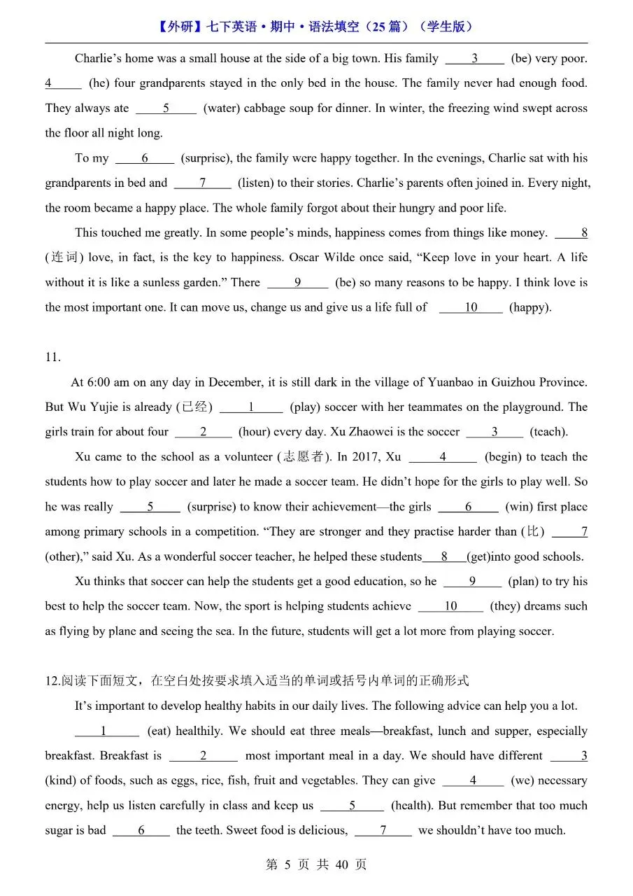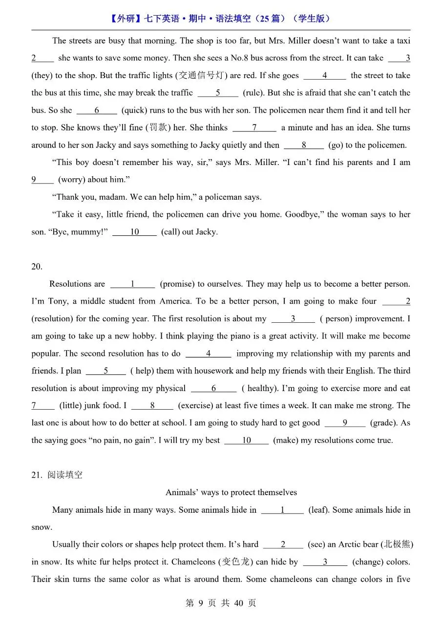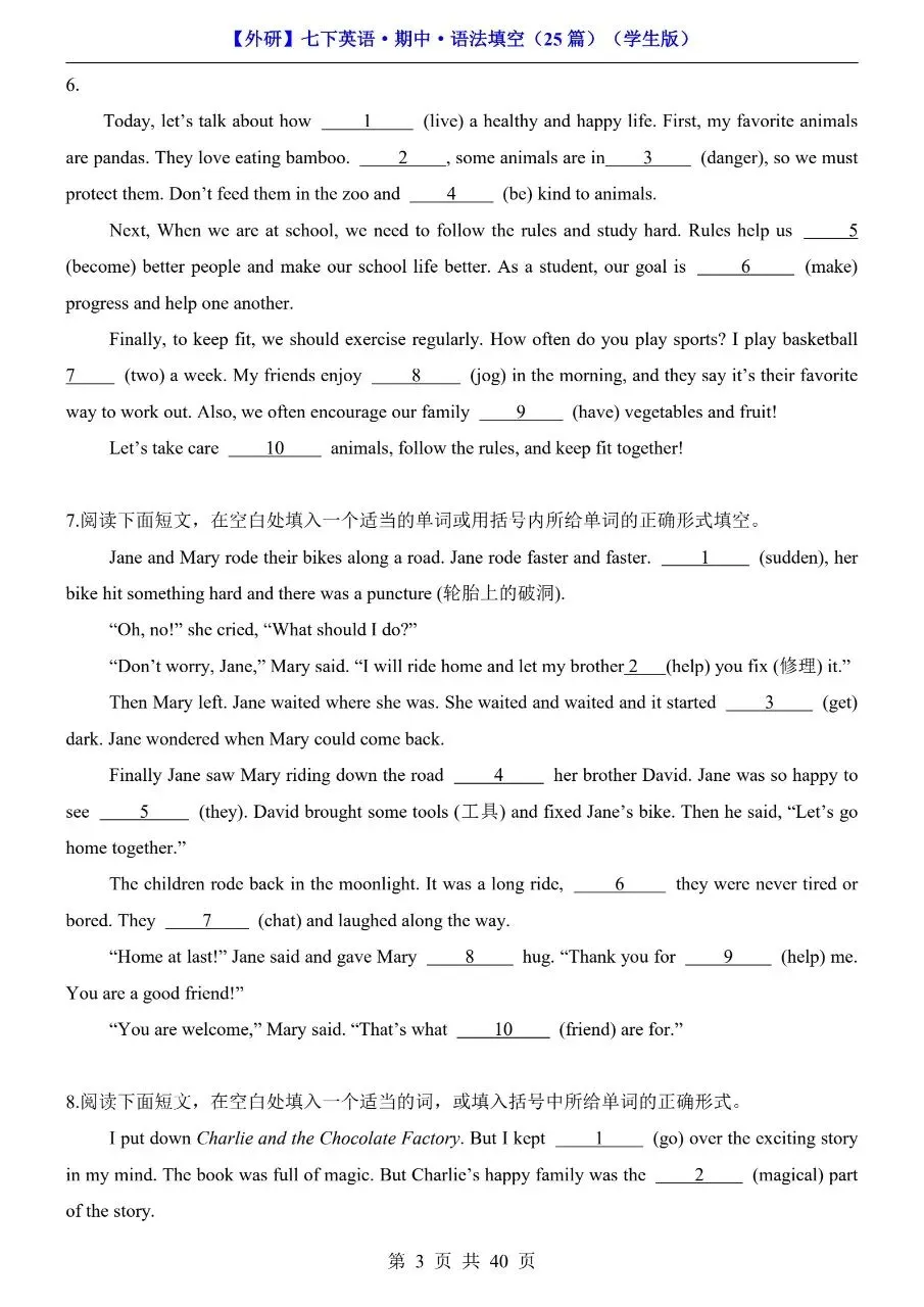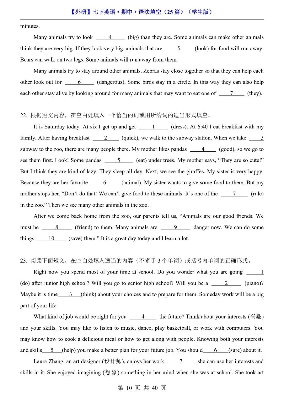 26年春七年级下册英语外研版语法填空专项练习题!附解析和答案!完整可打印! 今日分享:初一英语分水岭,语法填空丢分太致命!时态混乱、词形变换抓不准、介词介词乱用,短文填空一错全错?别担心!专为七年级下册外研版学生整理语法填空专项练习题,紧扣教材语法考点,覆盖时态、非谓语、固定搭配等核心内容,每空附详细解析+答案,不仅给答案,更教你解题思路,孩子吃透方法、做题不踩坑,轻松拿下语法填空高分! 初一英语语法是初二、初三进阶的核心基础!这份外研版专项练习,精准对接考点,破解语法填空难题,帮孩子告别“凭感觉蒙”,实现“精准做对”,英语成绩稳步提升! 需要的家长可打印出来给孩子读记练习! 萌兔快印 I彩印5分 打印清晰 篇幅有限,仅展示部分内容 获取完整电子版: ①:点一点右下角的“赞”和“推荐”,谢谢! ②:关注公众号,公众号对话框发送关键词“电子版”! 特别声明 本微信公众账号分享的资源版权属于原出版机构或影像公司,本资源为电子载体,传播分享仅限于家庭使用与交流心得、参考和辅助购买决策。文章中的视频及图片均来自网络,版权归原作者或原出版社所有。如有侵权,请及时联系删除。