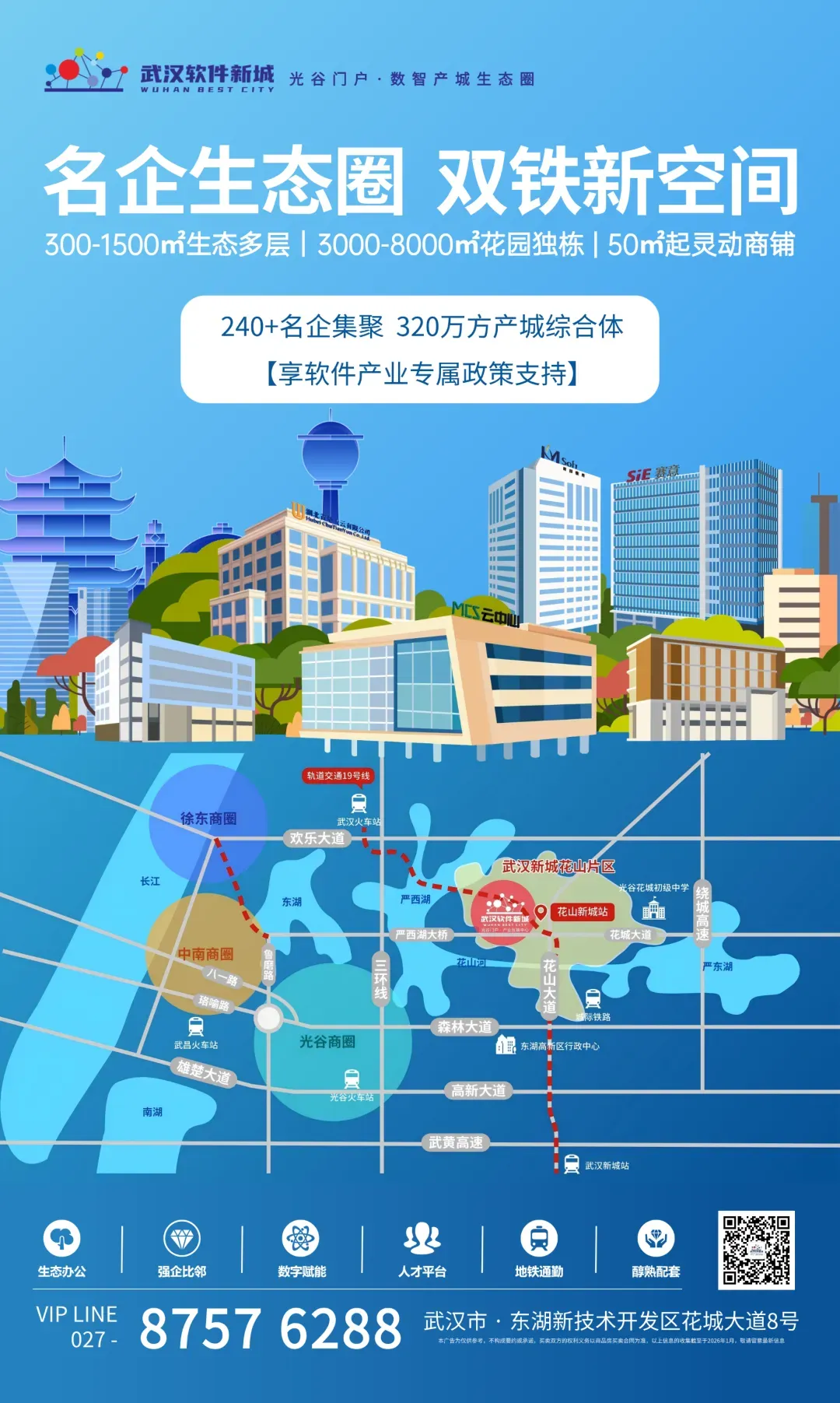 武汉软件新城位于武汉东湖国家自主创新示范区内,是花山生态新城的核心产业区,是中国光谷世界级“黄金十字轴”纵轴北端门户,总用地3.4平方公里,建设规模约320万平方米,计划总投资超200亿元。园区生态环境优美,交通便利,紧邻花山大道、花城大道两条城市主干道,轨道交通19号线在园区设置花山新城站,一线串联园区与主城区。