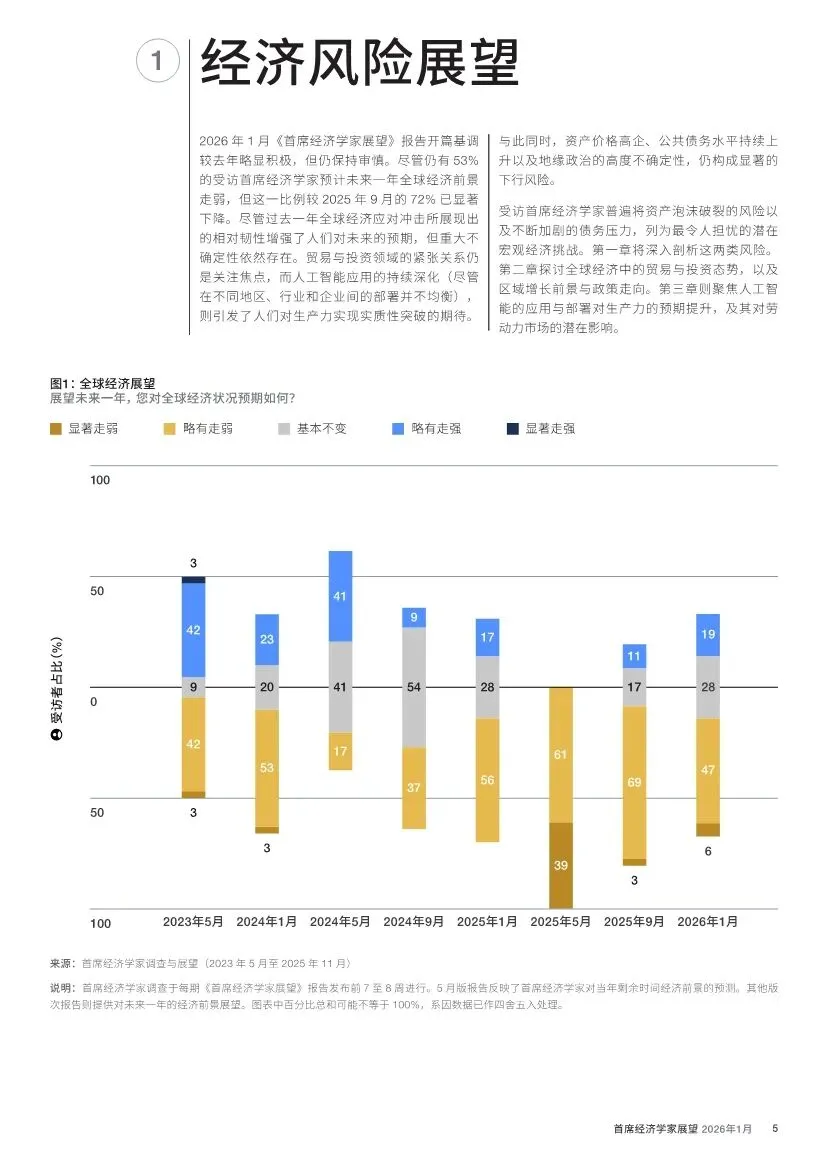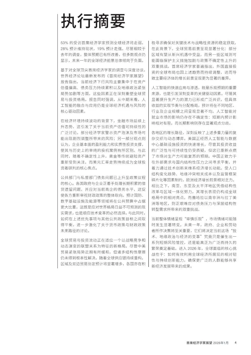 2026年初,全球顶尖首席经济学家们的心情,犹如在迷雾中审视一场光影交错的盛宴。世界经济论坛的最新调查显示,尽管对经济的悲观预期较去年有所缓解,但53%的受访者仍预计未来一年全球经济将走弱。这份报告揭示,全球经济正运行于一条脆弱的平衡木上:一端是人工智能(AI)投资驱动的生产力曙光与市场繁荣,另一端是堆积如山的债务、地缘裂痕带来的贸易阻滞以及资产估值高企的隐忧。各国增长路径在多重力量拉扯下,将呈现显著的“分裂前行”态势。