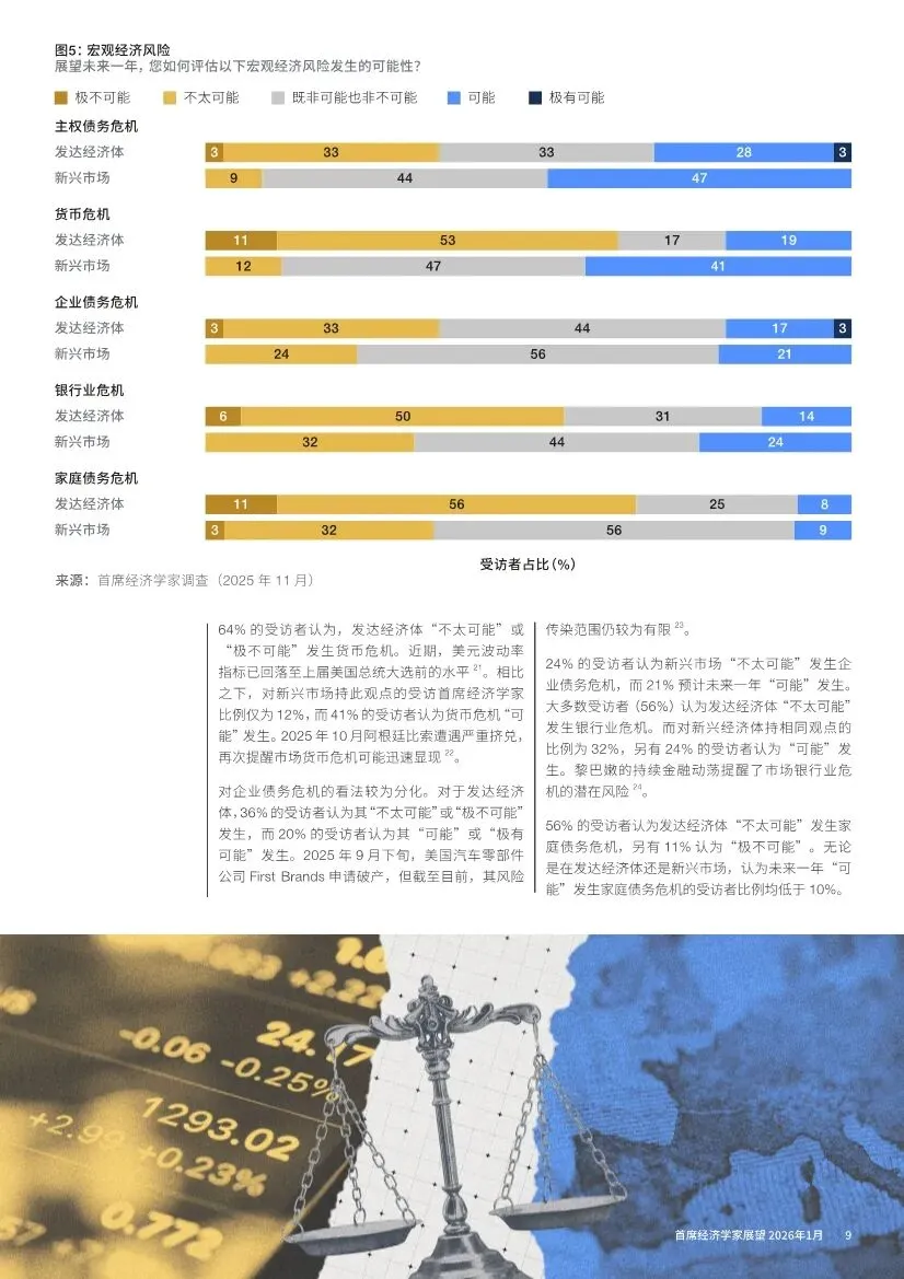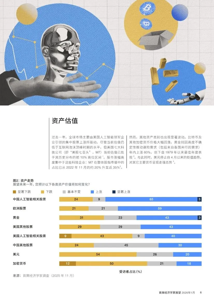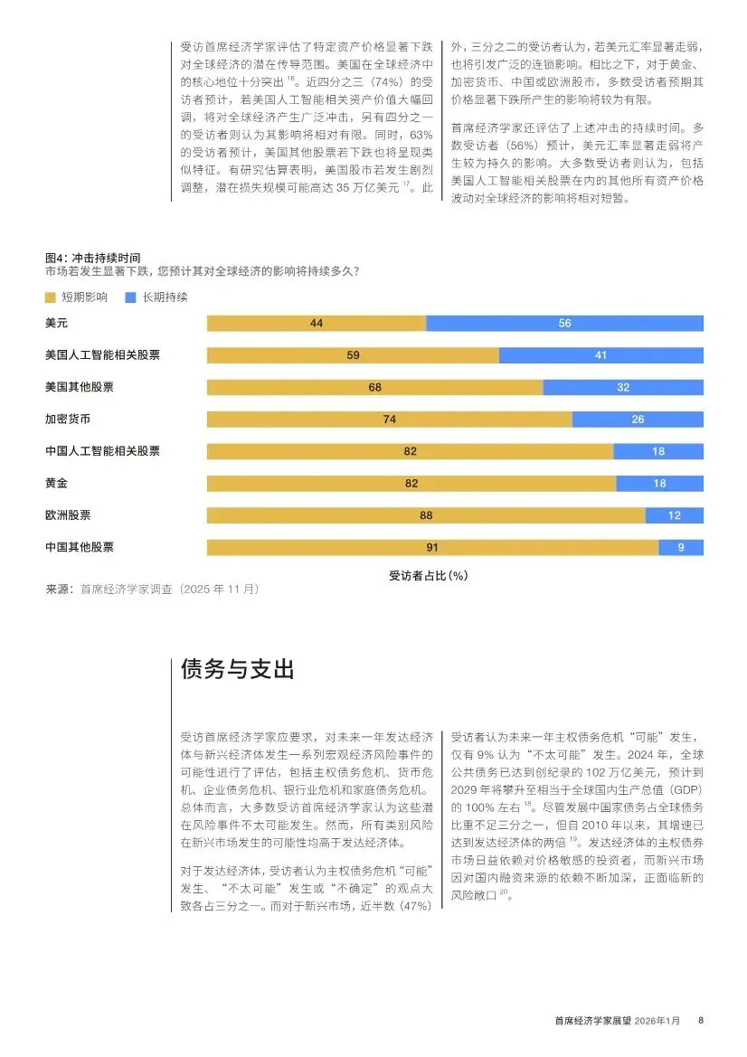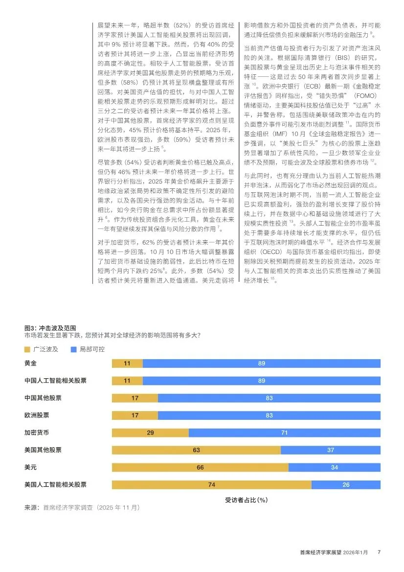 资产估值之忧:由美国AI巨头引领的股市集中上涨,引发了对资产泡沫的广泛讨论。52% 的首席经济学家预计美国AI股将回调。国际清算银行警告,美股与黄金同时呈现历史性的泡沫特征。若美国AI资产暴跌,74% 的专家认为将对全球经济产生广泛冲击。与此同时,黄金作为避险资产价格飙升,加密货币大幅波动,市场情绪脆弱。