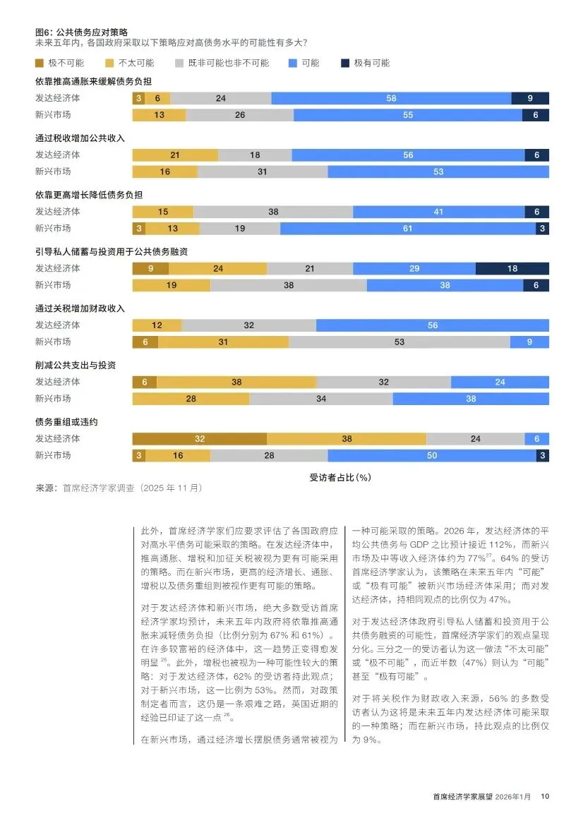 债务压力山雨欲来:全球公共债务已达创纪录的102万亿美元。47% 的专家认为新兴市场未来一年“可能”发生主权债务危机。为应对债务,多数经济学家预计政府将诉诸 “推高通胀” 和 “增加税收”。超过半数的专家认为,关税也可能成为发达经济体增加财政收入的工具。