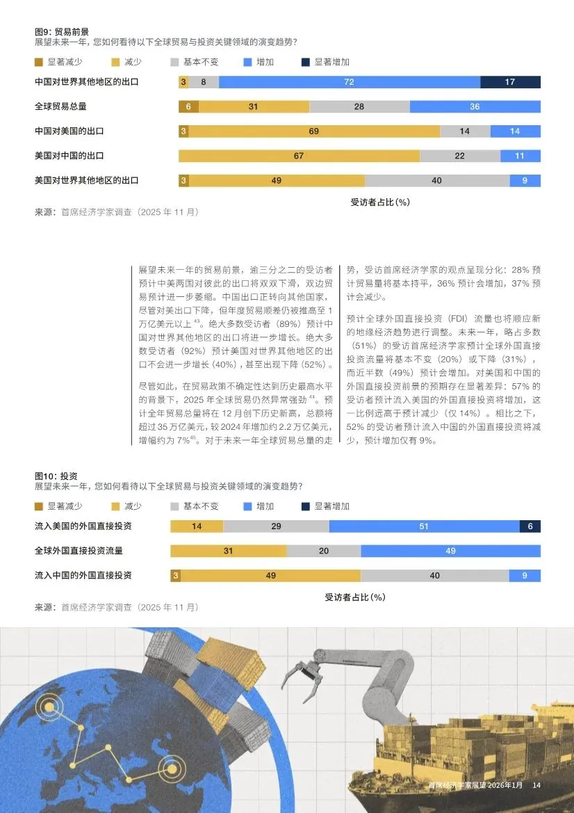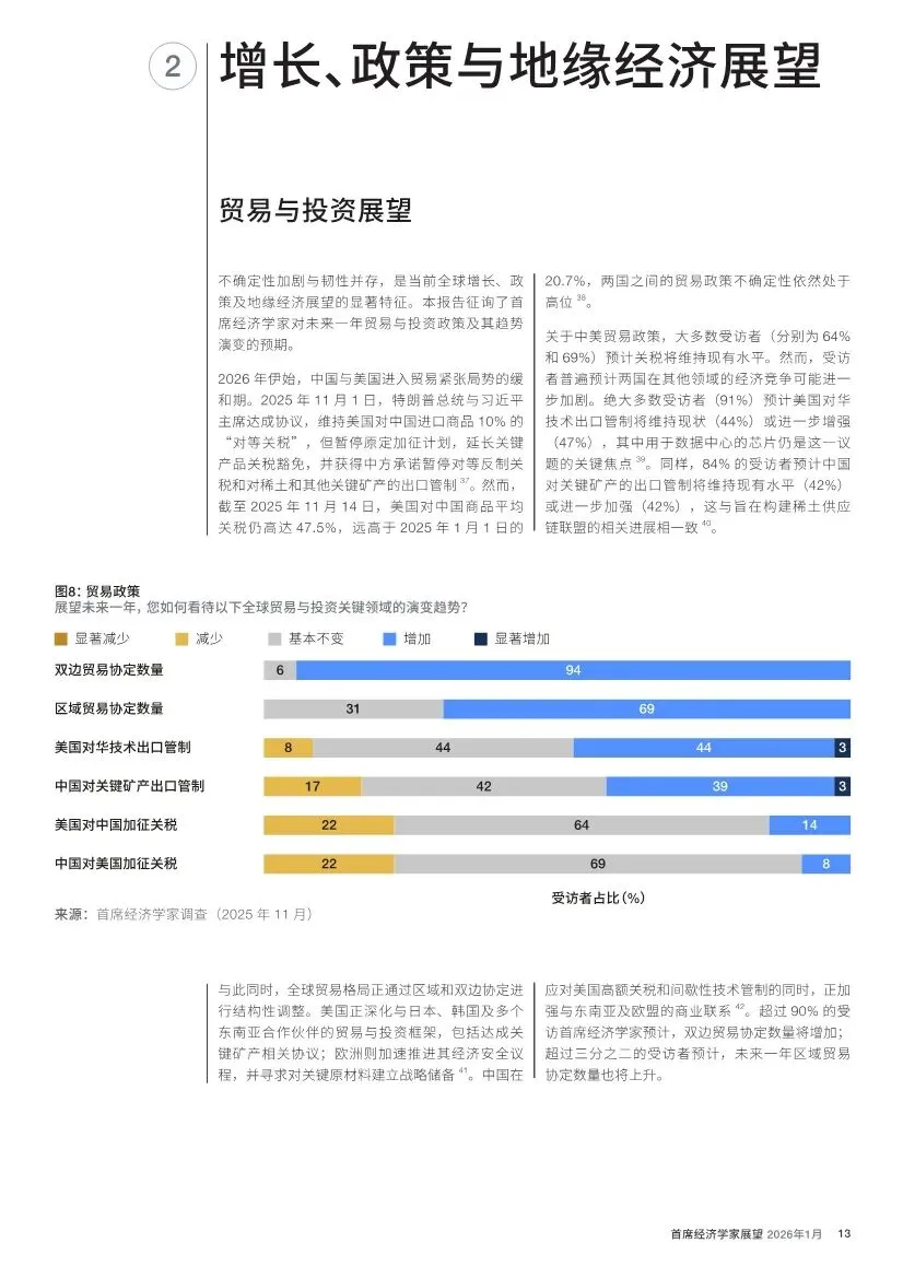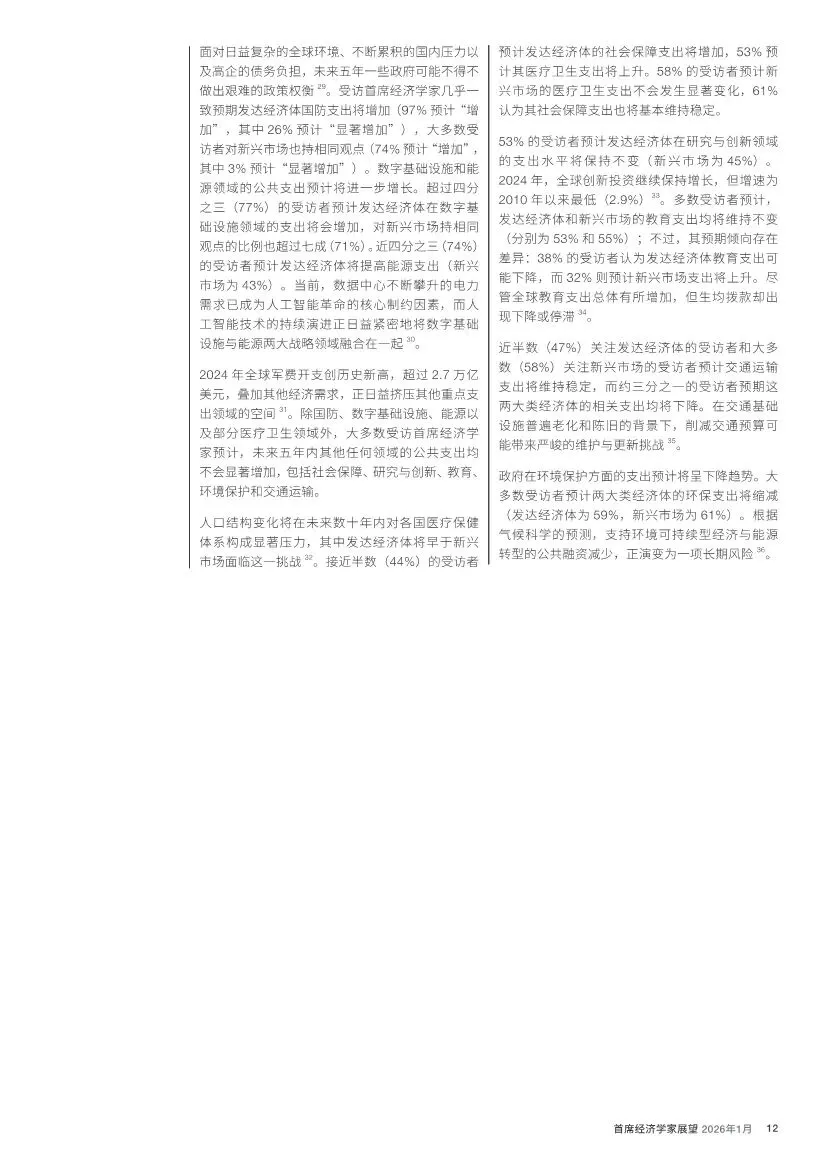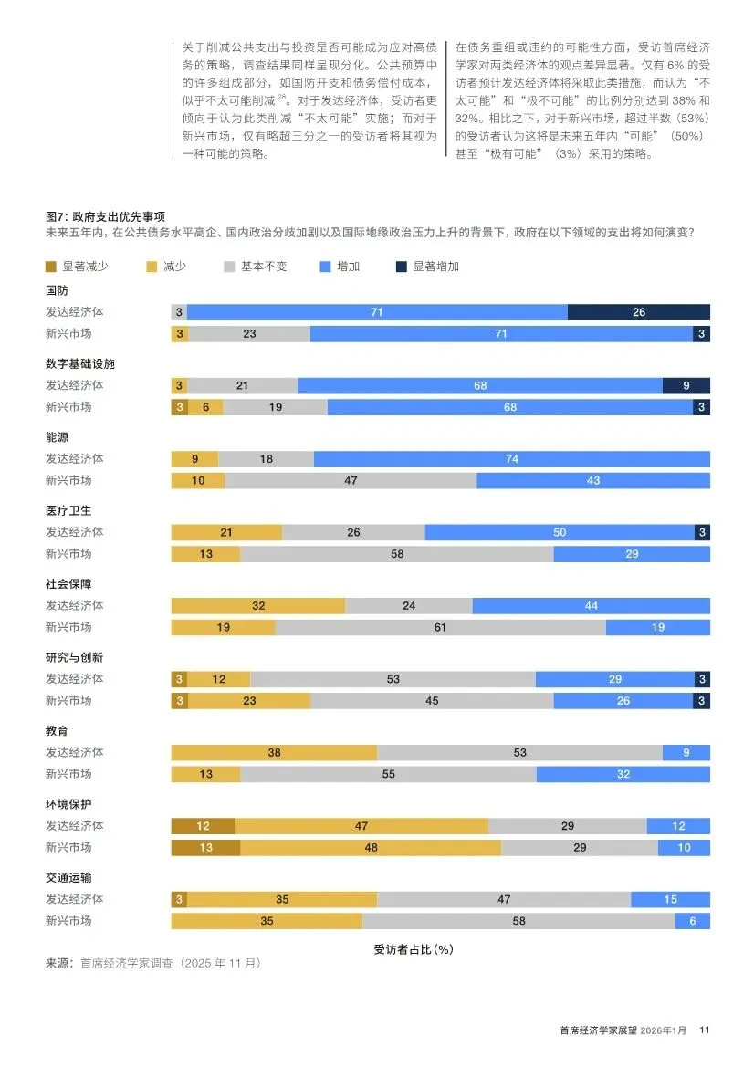 防御性支出增加:绝大多数(97%)经济学家预计,发达经济体将增加国防开支。同时,数字基础设施和能源安全与转型也被列为支出重点。