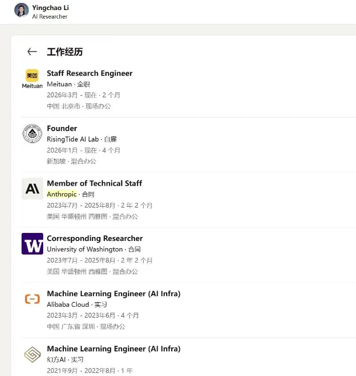 但其实习与工作经历亮眼,本科期间在商汤、幻方量化(DeepSeek母公司)从事机器学习相关实习,硕士阶段在阿里云负责AI Infra。2023年加入Anthropic后,负责Claude大模型后训练、RLHF/RLAIF、数据体系及对齐等核心工作。2025年8月他从Anthropic离职,年初在新加坡创立AI实验室,不久后选择加入美团。此次招聘也意味着,此前较少参与AI人才竞争的美团正式下场加码大模型,国内大厂大模型竞争格局进一步变化。(申妈的朋友圈)