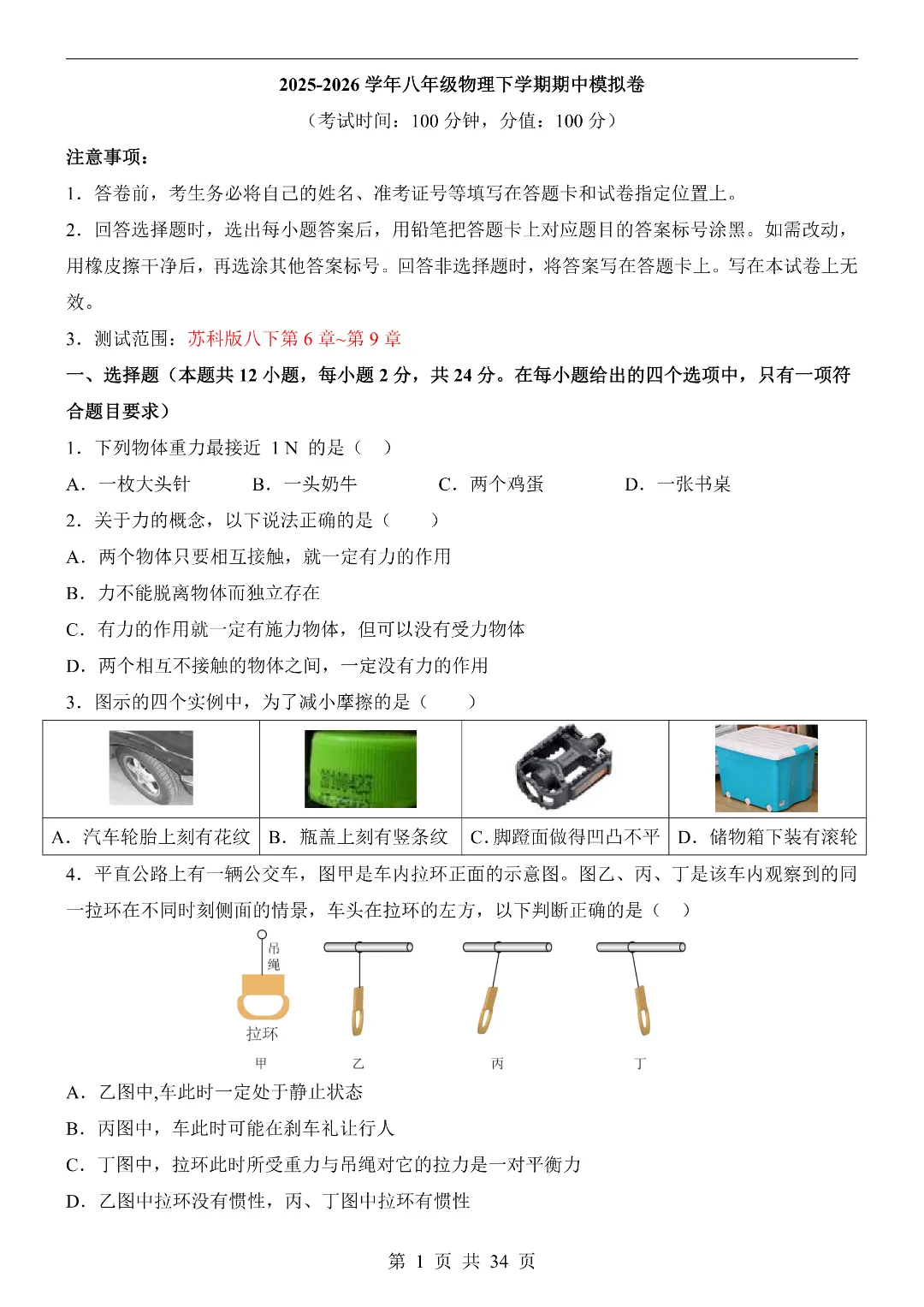 2025-2026年春新八年级下册苏科版物理《期中模拟测试卷》含答案解析‖可打印