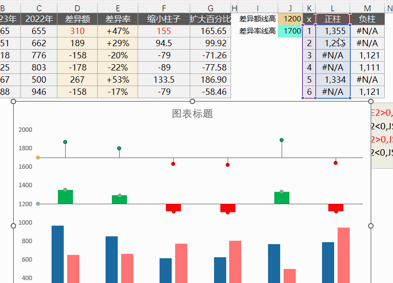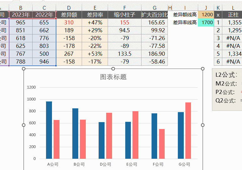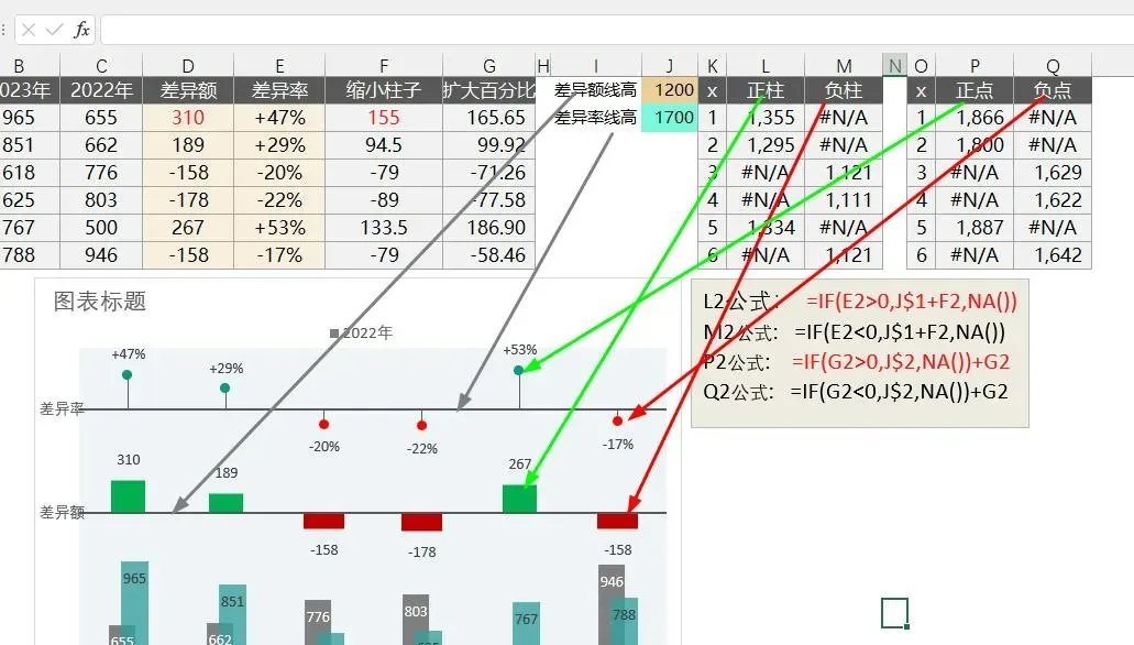 J1的值是差异额线的暂定高度(如高度不合适可以通过修改单元格值调整);J2的值是差异率线的暂定高度。K:M列是差异柱的散点值区域,K列是Y值,L列是计算正柱的位置,M列是计算负柱的位置。O:Q列是差异率的计算区域,同差异额。