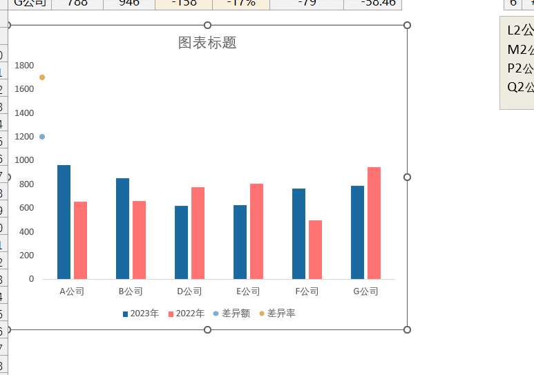 添加数据标签,显示D列、F列的真实值。差异率的添加方式相同,略。