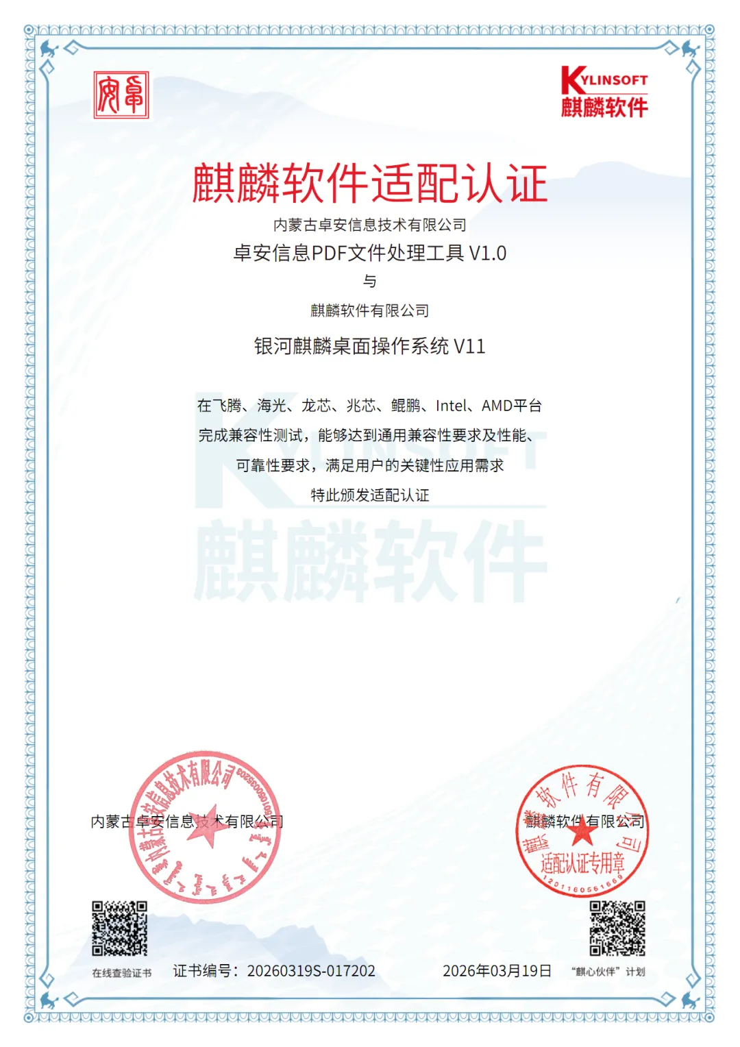 卓安信息PDF文件处理工具与公文二维条码生成软件两款产品与麒麟桌面系统V11适配完成