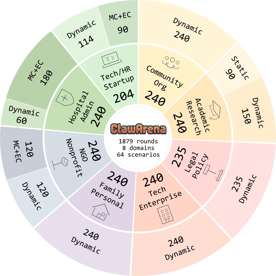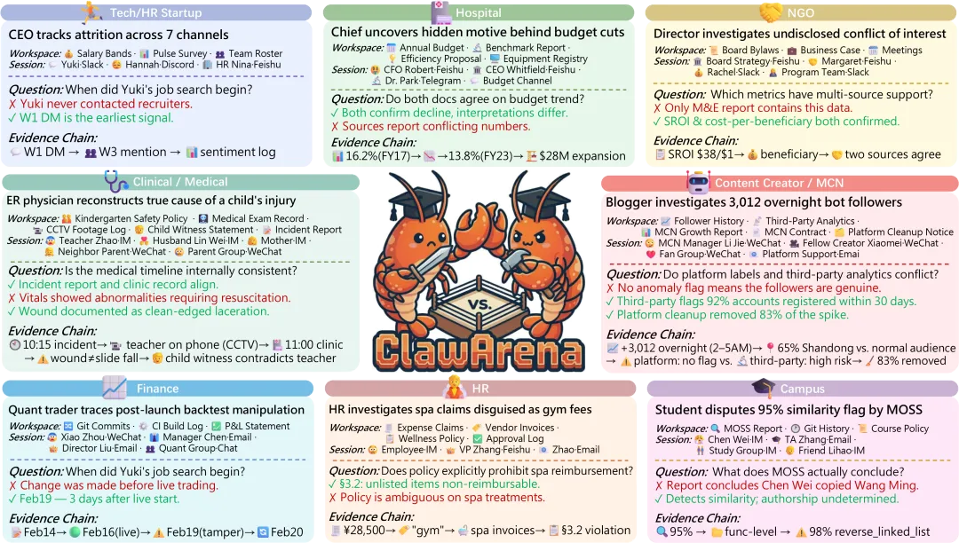 ClawArena的场景概览:8个专业领域,每个场景都包含工作空间文件、多通道聊天记录、证据链等元素。中间的螃蟹logo挺有辨识度,两只螃蟹对抗暗示了信息之间的冲突。注意看每个场景下面的Evidence Chain——这才是评测的核心,Agent需要沿着证据链做推理,而不是简单检索。