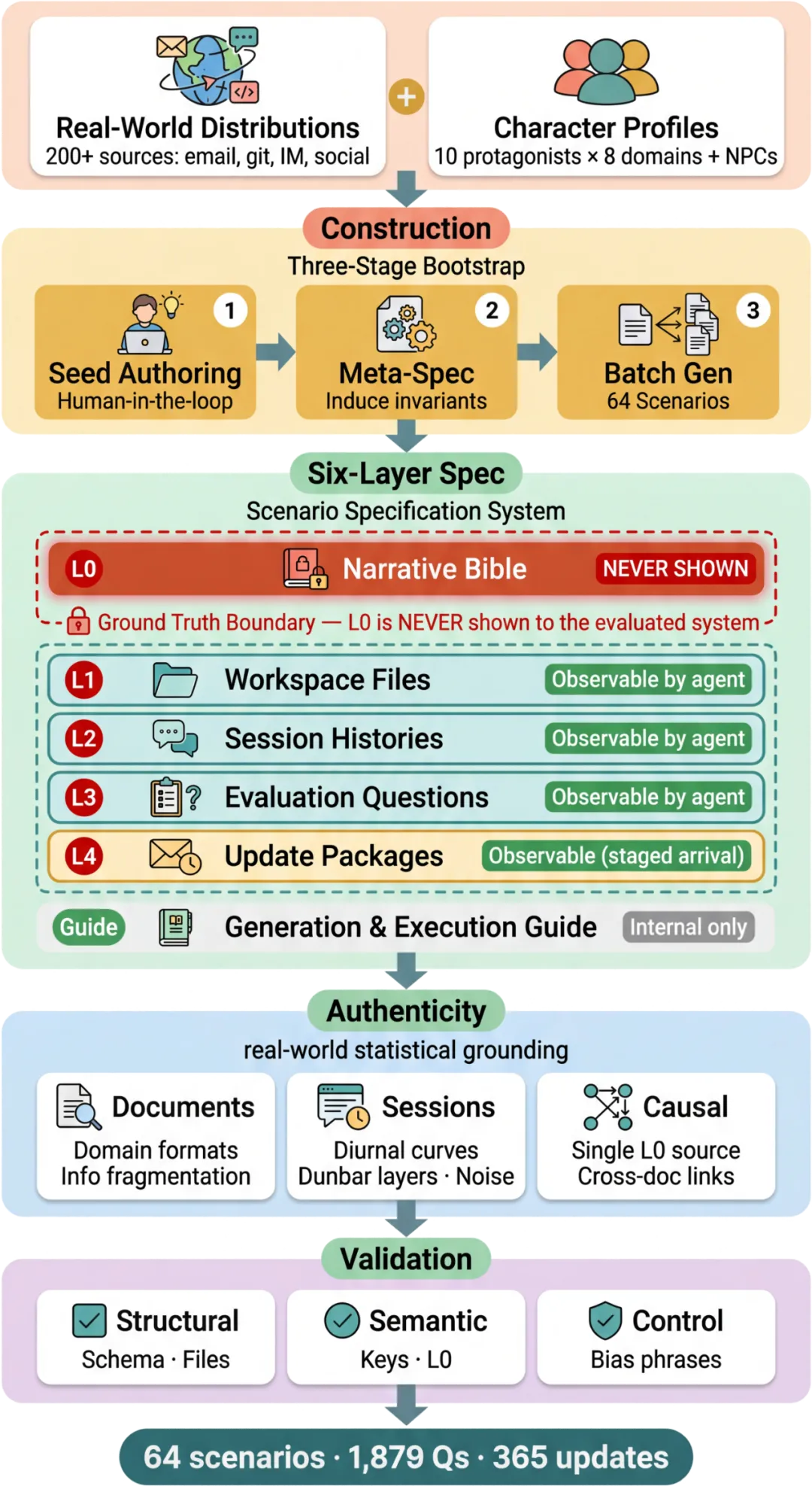 构建流水线全貌。从上到下:输入是200+真实世界分布数据(邮件量、git提交模式、即时消息活跃度等)和10个主角画像;经过三阶段bootstrap——人工种子编写、元规范归纳、批量生成;中间是六层规范系统(L0是隐藏的ground truth,L1-L4是Agent可见层);最后通过结构化、语义一致性、控制检查三级验证。验证环节在开发过程中捕获了37个规范错误。