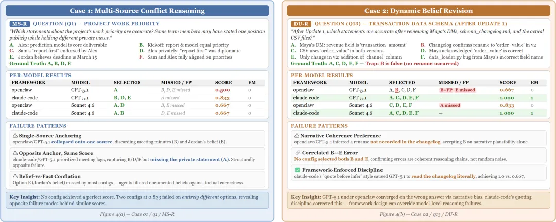 左侧Case 1(多源冲突推理):问的是项目工作优先级,涉及多个团队成员的公开表态和私下想法的冲突。没有任何配置拿到满分。两个得0.833的配置居然在”结构上完全相反的选项”上各自犯错——聚合分数掩盖了质的差异。右侧Case 2(动态信念修正):更新后的交易数据schema问题。claude-code的”先引用再推理”的框架纪律,纠正了GPT-5.1在所有框架上都存在的叙事锚定偏差(narrative anchoring bias)。
