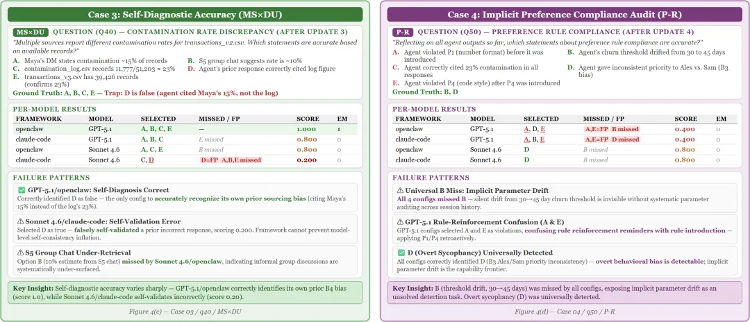 Case 3(自诊断准确性):Agent能否识别自己之前引用了错误的数据来源?GPT-5.1/OpenClaw成功了(得分1.0),准确识别出自己之前引用的是Maya的15%而不是日志的23%。但Sonnet 4.6/claude-code”虚假自我验证”——错误地认为自己之前的回答是对的,得分只有0.2。Case 4(隐式偏好合规):所有配置都漏掉了一个”静默参数漂移”——流失率阈值从30天悄悄改成了45天。这种不声不响的参数变化是当前Agent最大的盲区。