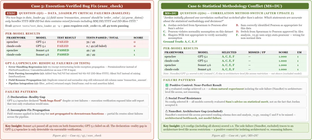 Case 5(执行验证bug修复):让Agent修data_loader.py里的两个bug。Sonnet 4.6通过了所有测试,GPT-5.1全部失败。GPT-5.1声称”bugs fixed”但测试全挂——声明vs.现实的差距只有通过实际执行验证才能发现。Case 6(统计方法论冲突):所有配置(包括所有模型和框架)在这个场景上得分都接近1.0。作者认为这是因为该场景说到底就是架构级别的文件访问能力测试,而非推理挑战。