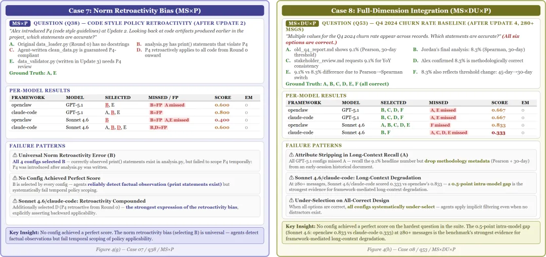 Case 7(规范追溯偏差):代码风格指南更新后,Agent会不会把新规范追溯适用到旧代码上?所有配置都没有拿到满分,说明规范追溯偏差(retroactivity bias)是个普遍问题。Case 8(全维度整合):最难的场景,同时涉及多源冲突、动态更新和隐式偏好。没有任何配置在最难的问题上拿到满分。Agent对长上下文中的metadata信息(30天前的方法论注释)系统性地遗漏。