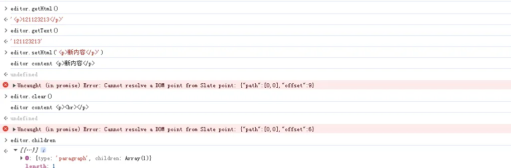 // 获取 HTML 内容const html = editor.getHtml()// 获取纯文本const text = editor.getText()// 设置 HTML 内容editor.setHtml('<p>新内容</p>')// 清空内容editor.clear()// 获取 JSON 内容(用于保存)const content = editor.children