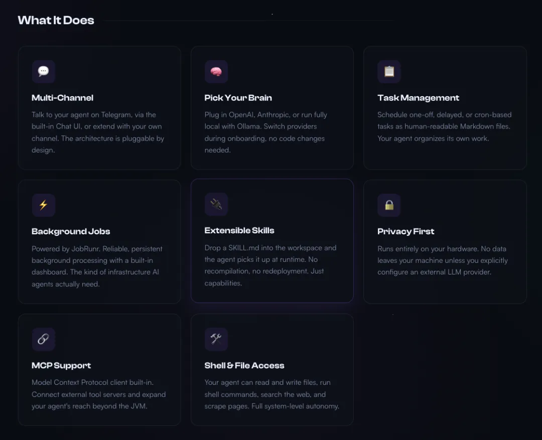 JavaClaw的功能覆盖日常开发、办公场景,而且扩展性极强,具体亮点如下: