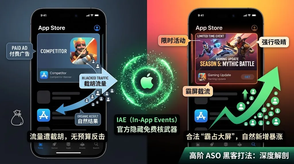 自己的流量被明目张胆地截胡,而自己又没有雄厚的预算去反击竞价,该怎么办? 其实,苹果官方在后台隐藏了一个能够合法“霸占大屏”、强行吸走所有目光的免费核武器——In-App Events (App 内活动,简称 IAE)。 这不仅是一个运营工具,更是高阶 ASO (应用商店优化) 操盘手眼中的免费霸屏截流器。今天,我们就来深度解剖这套不花一分钱,却能让自然新增极速暴涨的黑客打法。