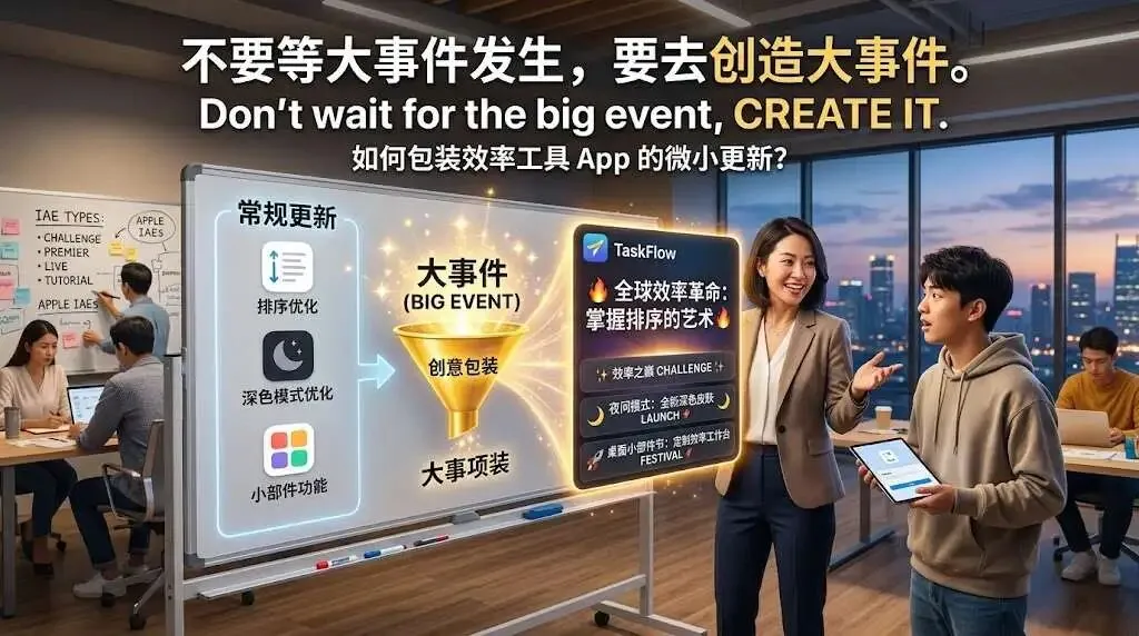 Major Update (重大更新):新瓶装旧酒的艺术 哪怕你只是优化了 PDF 导出的速度,你也可以包装成:“【极速引擎上线】办公效率革命!体验全新闪电导出功能!” 配上一段极具科技感的 15 秒介绍视频。这在苹果眼中,就是一个极具价值的重大更新事件。