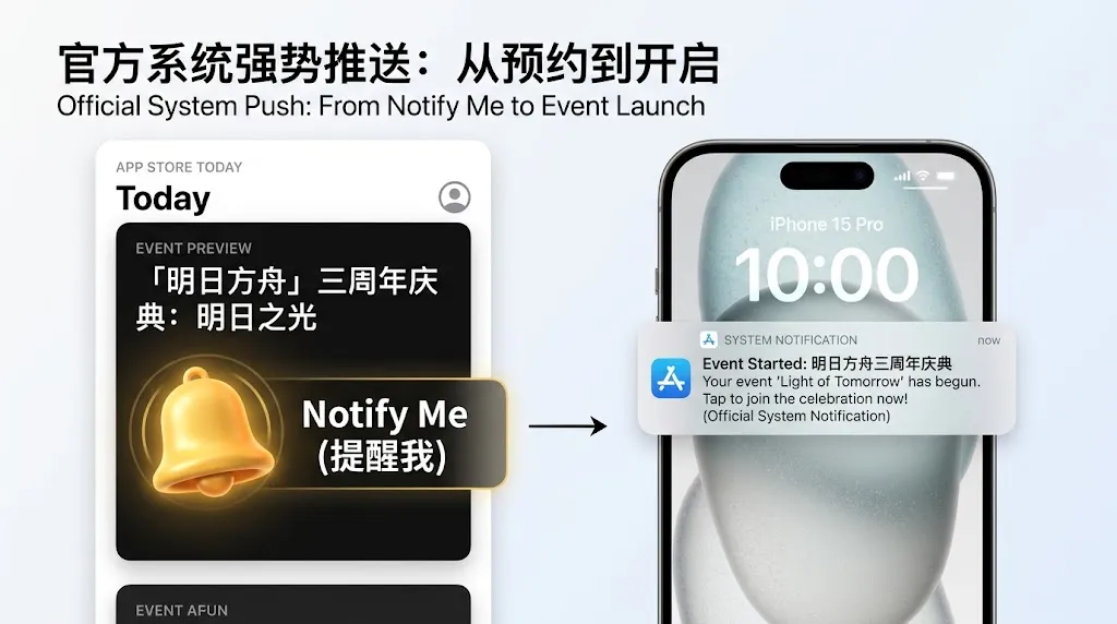 官方系统的强势推送: 当用户在 App Store 看到你的活动预告卡片并点击了极其醒目的小铃铛图标“Notify Me(提醒我)”后,到了活动开启的那一刻,苹果系统会在系统底层(且无视你在 App 内的 Push 权限状态),直接向用户的锁屏界面发送一条官方通知!