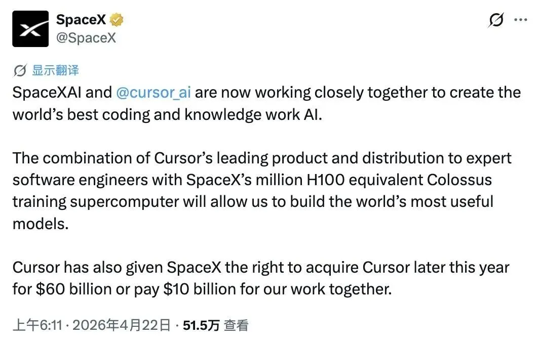 当地时间 2026 年 4 月 21 日,埃隆・马斯克旗下 SpaceX 通过 X 平台发布重磅声明:已与 AI 编程工具初创公司 Cursor 达成战略协议,获得在 2026 年底前以 600 亿美元全资收购 Cursor 的独家选择权;若最终放弃收购,则需向 Cursor 支付 100 亿美元作为合作对价。这笔交易既是马斯克补齐 AI 编程短板、整合 xAI 与 SpaceX 算力的关键落子,更是其冲刺1.75 万亿美元估值、750 亿美元募资史上最大 IPO 前,对科技叙事与增长引擎的强力加固。
