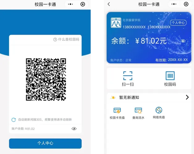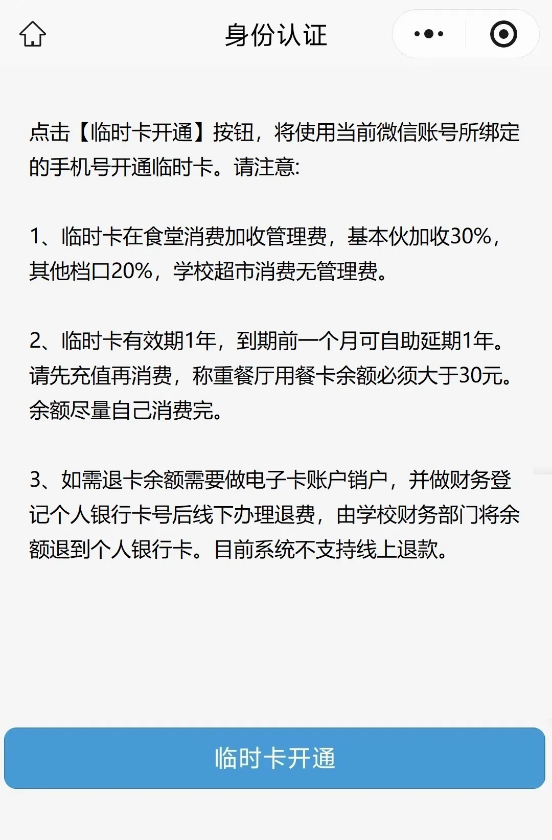 临时人员就餐卡激活后手机页面如下,微信充值后您的就餐卡就可以在校园一卡通的pos卡机上扫码消费了。