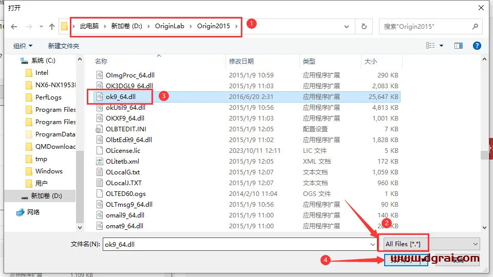 23、打开软件安装位置,将找到ok9_64.dll选择文件类型为:All Files [“*.*],然后就在文件里面找到ok9_64.dll。32位的为:ok9.dll