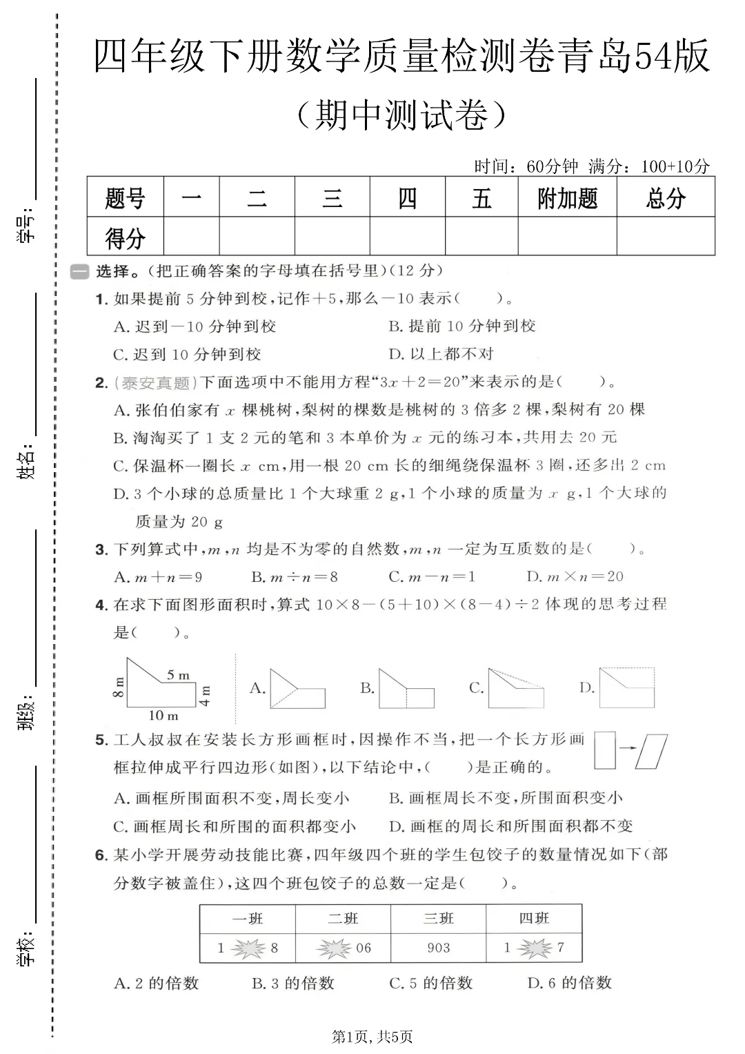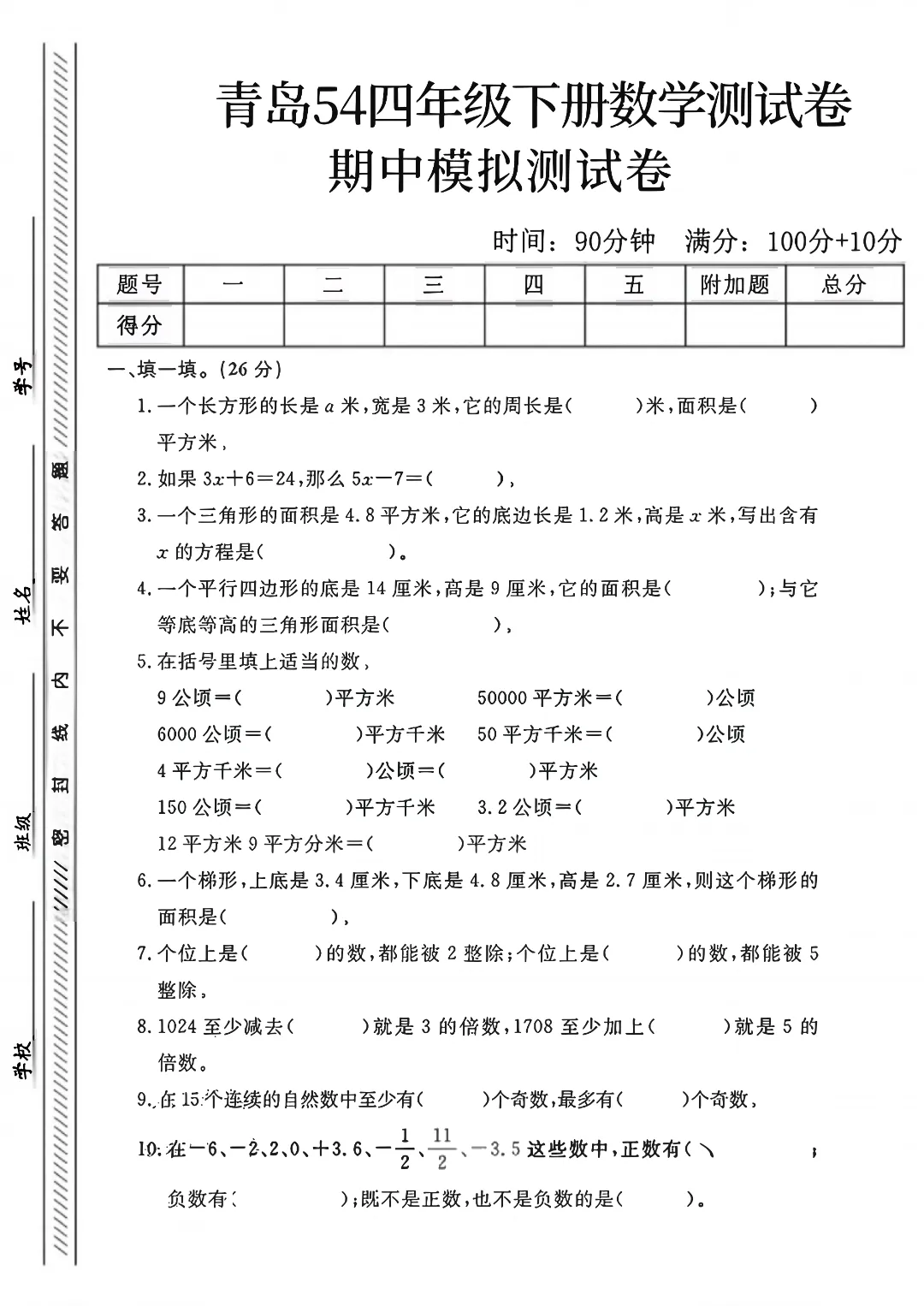 ✨今日给家长朋友们分享的是:26年春新四年级下册青岛54版数学《期中考试质量检测卷4套》附答案解析 电子版可打印