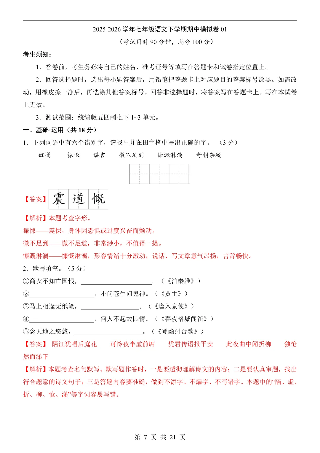 ✨今日给家长朋友们分享的是:25-26年春新七年级下册统编版54制语文《期中考试模拟检测卷2套》附答案解析 电子版可打印