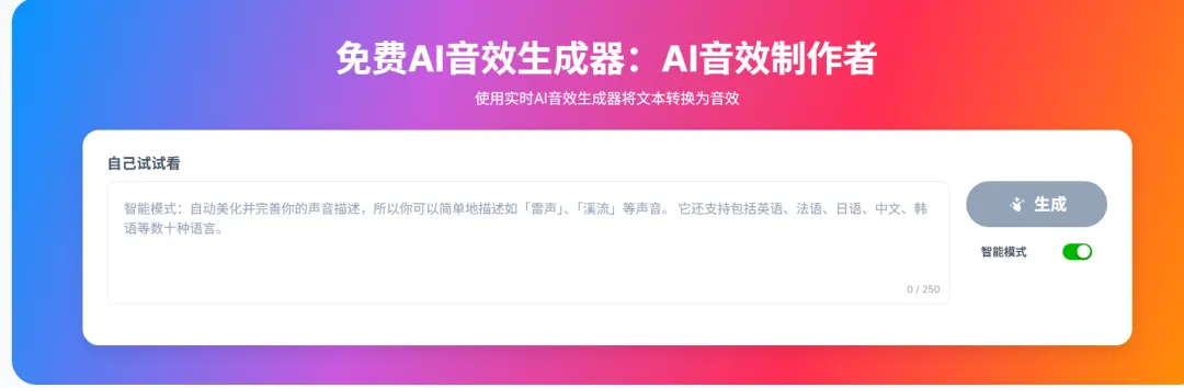 AISFX 网址:https://aisfx.org/zh 特点:支持多种音效类型(电影、游戏、环境等)、跨平台兼容。基础功能完全免费,适合入门测试。 -
