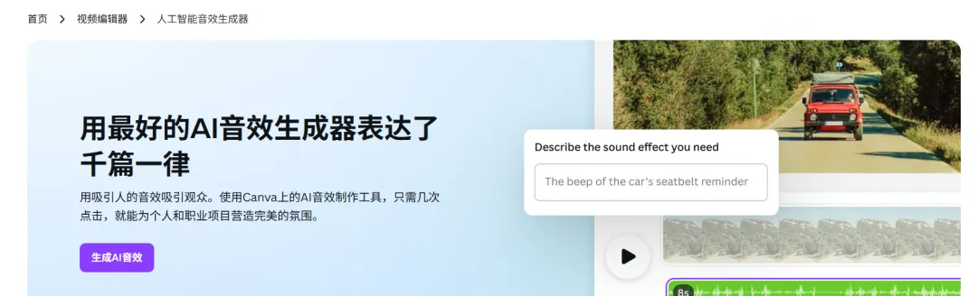 Canva AI 音效生成器 网址:https://www.canva.com/features/ai-sound-effect-generator/ 特点:内置Canva编辑器中、提供1个免费额度、操作直观。适合日常设计和社交媒体内容创作。 -