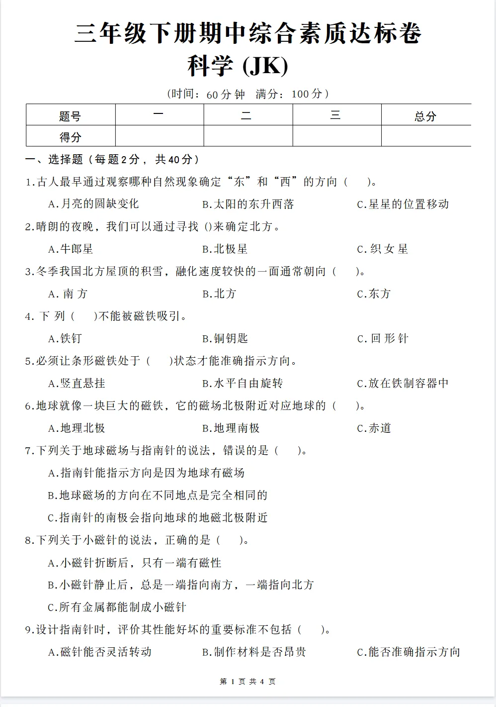 小学科学《期中质量检测卷》