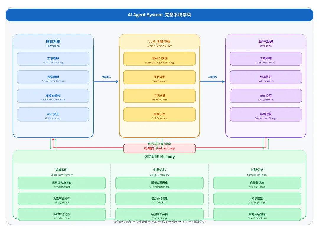 环境交互:Agent 通过感知获取信息,通过执行改变环境,形成完整的反馈循环。